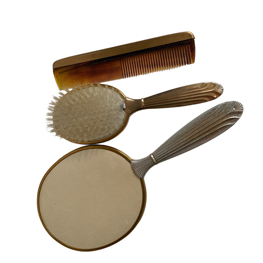 Vintage Gold Toned Lace Detail Dresser Mirror Brush and Comb Set