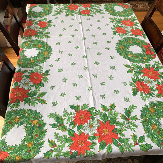 Vintage Ryan 1970s Christmas Tablecloth 64 x 49" Wreath Pointsettias