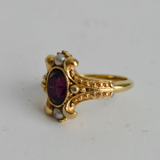 Avon Queensbury Faux Amethyst Pearl Gold Ring Vintage Size 5.5