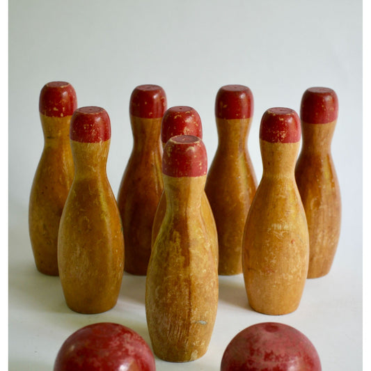 Lot 8 Vintage Wood Toy Bowling Pins 5" & 2 Balls Antique