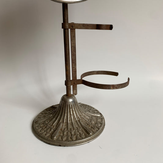 Antique Vintage Shaving Mirror Beveled Glass Stand Metal Mug & Brush Holder Arms