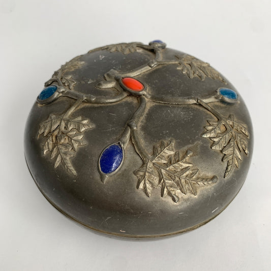 Antique Vintage Chinese Brass ? Stone Lidded Bowl 5.75 x 3" Silver