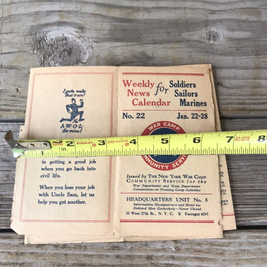 Antique Weekly News Calendar Soldiers Sailors Marines No. 22 NY War Camp WWI ?