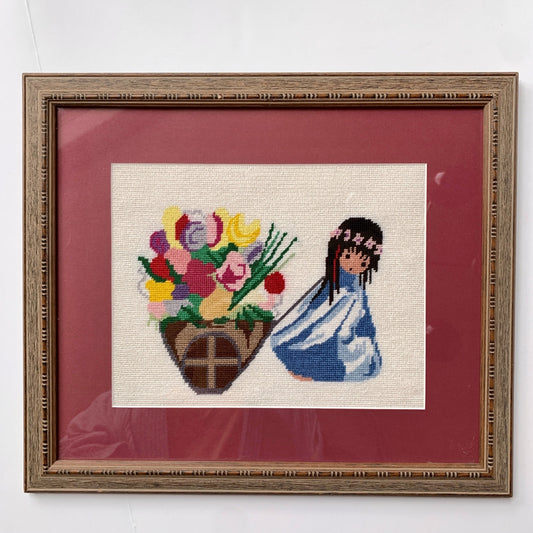 1970’s Framed De Grazia Needlepoint Native Girl with Basket of Flowers 18 x 15.25"