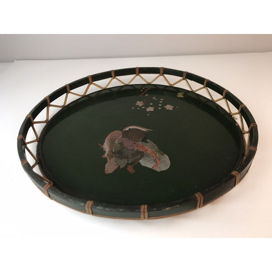 Vintage Asian Style Tray Basket Japanese? Chinese? Bird Home Decor Green