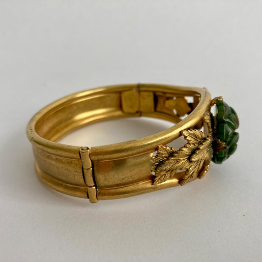 Vintage Art Deco Brass Bakelite Green Floral Hinged Bangle Bracelet