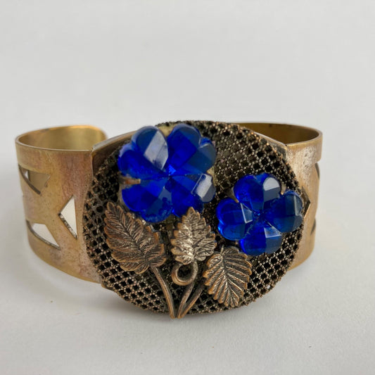 Vintage Brass Blue Glass Flowers Mesh Circle Hinged Bangle Bracelet