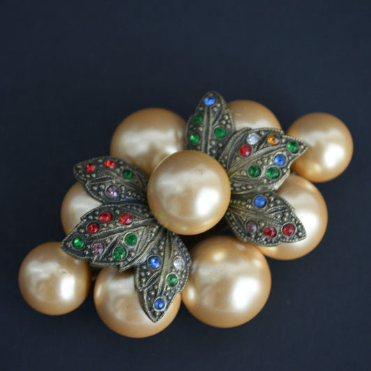 Vintage Faux Pearl Multicolored CZ Stones Brooch Leaves
