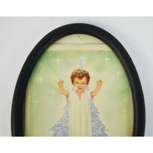 Vintage Oval Framed Christmas Greetings Glitter Angel Print