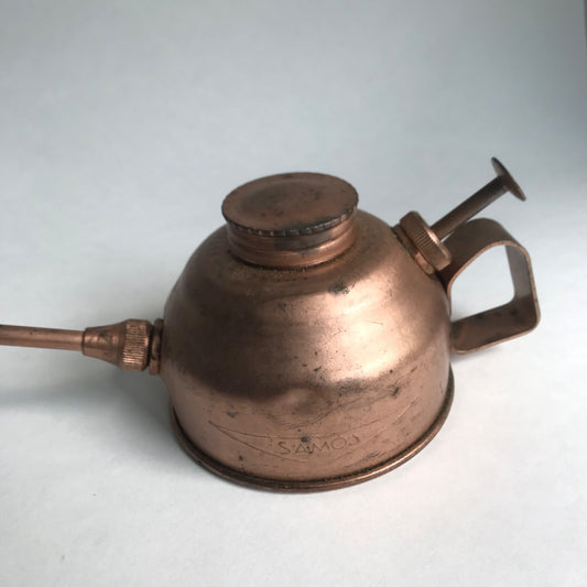 Vintage Samos Copper Oil Can Push Pump Oiler w/Long Spout