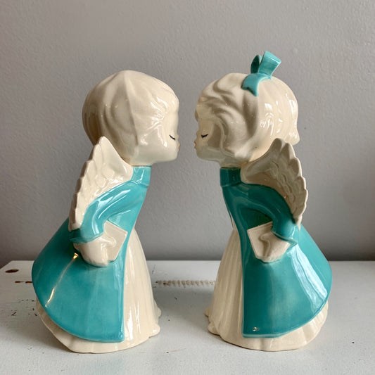 Vintage Teal & Ivory White Ceramic Kissing Angels Pair