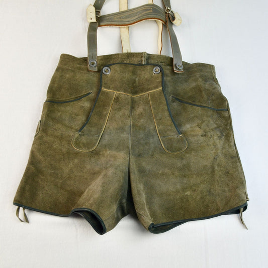 Lederhosen Men's Waist 33" Green Gray Vintage Suede Leather Suspenders Oktoberfest