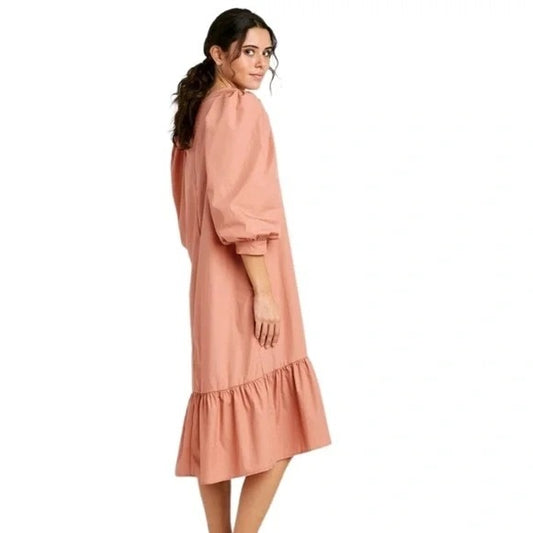 A New Day Puff Quarter Length Sleeve Ruffle Hem Midi Dress Coral/Nude New