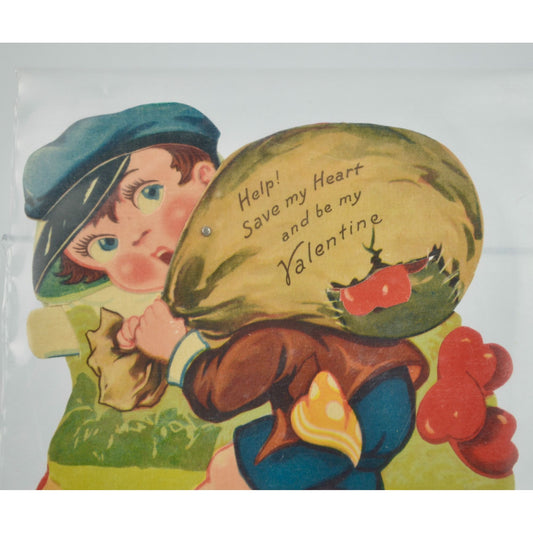 Vintage Die-Cut Valentine Card Boy Carrying Sack Of Hearts Articulating Germany