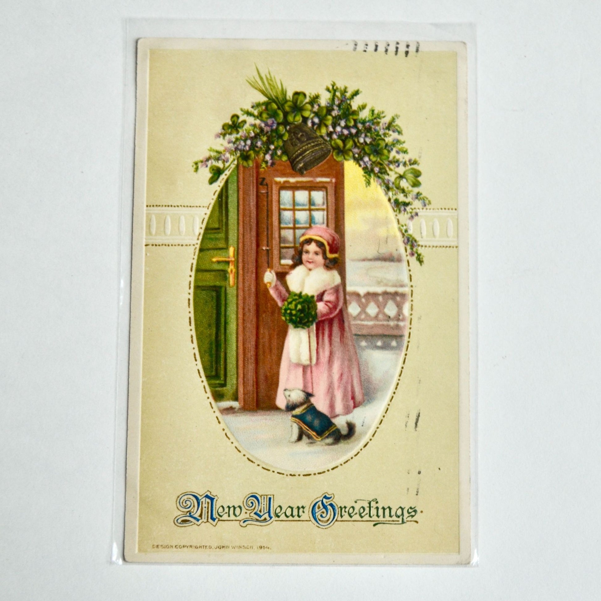 1914 Antique New Year Greetings Postcard Child Door Dog