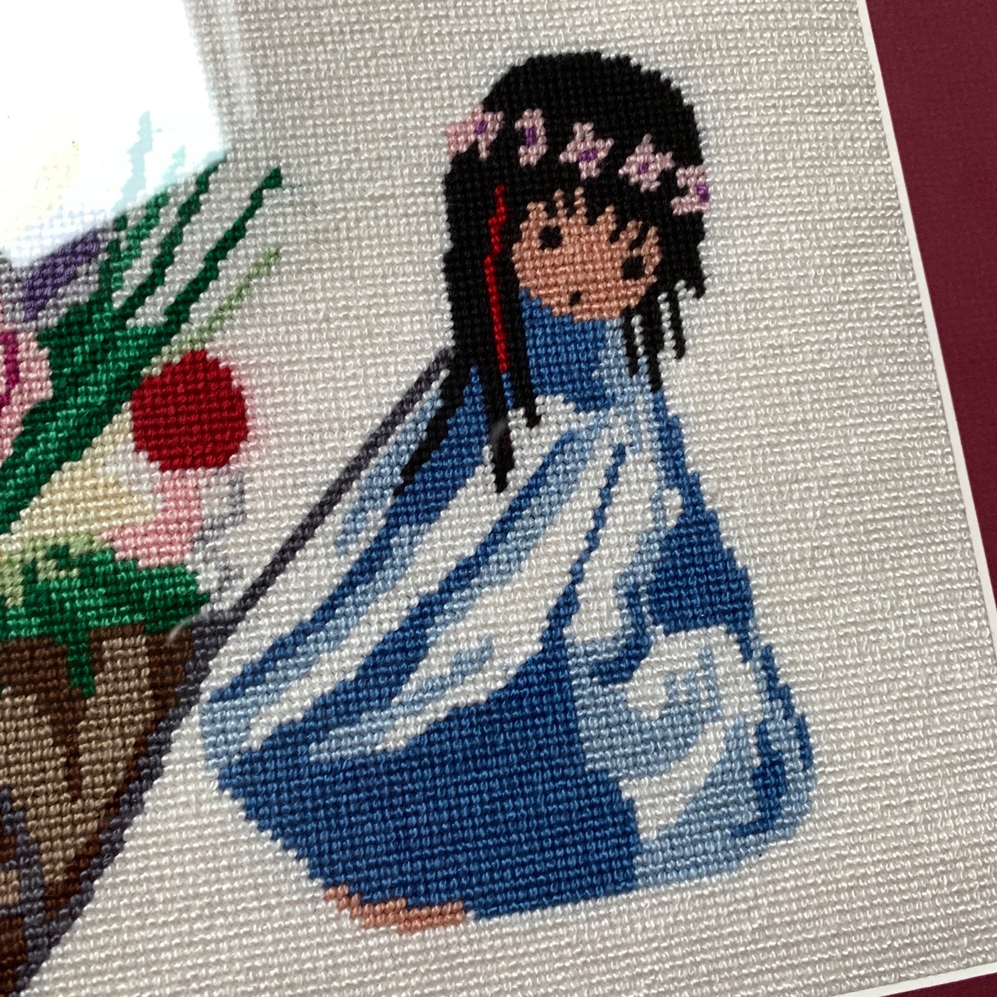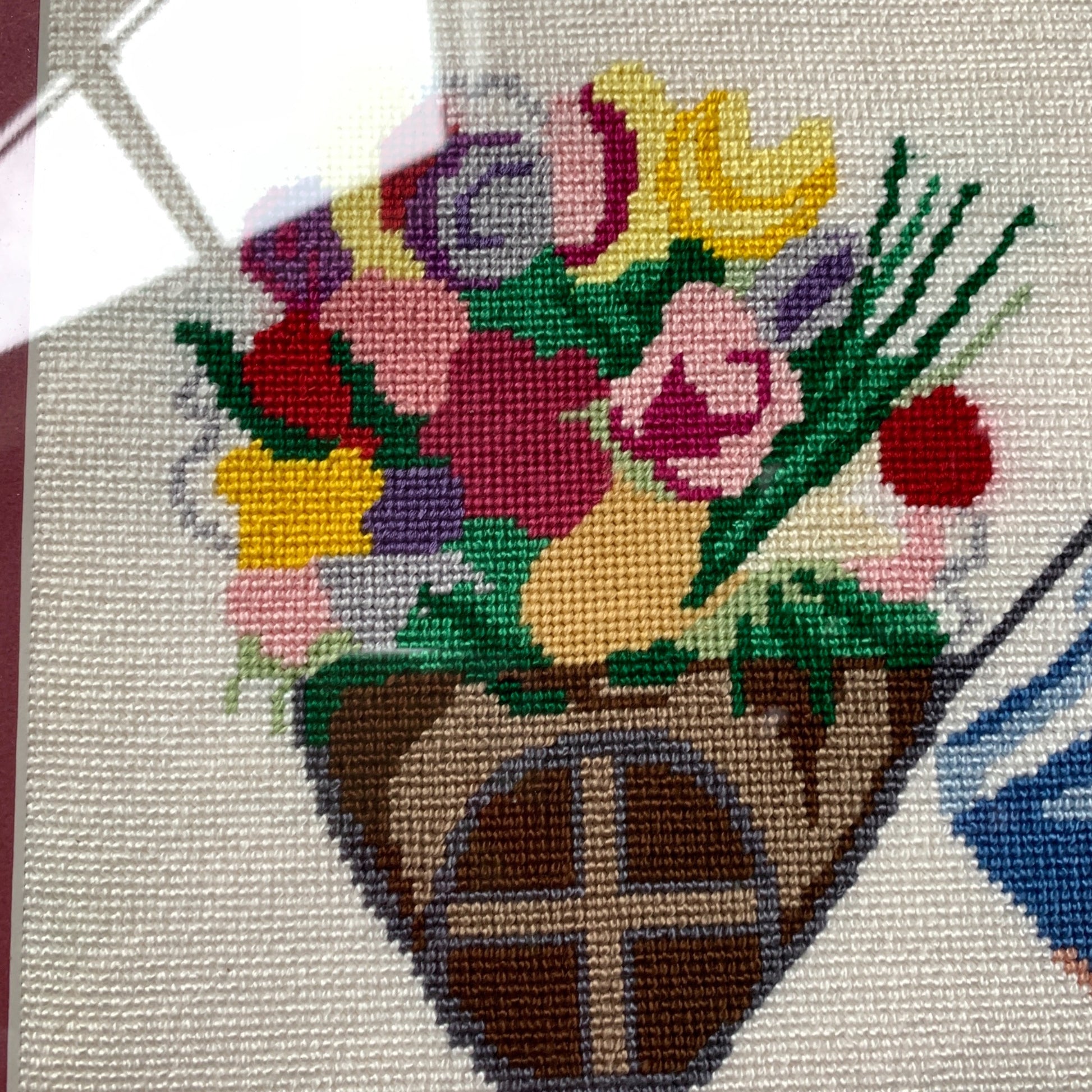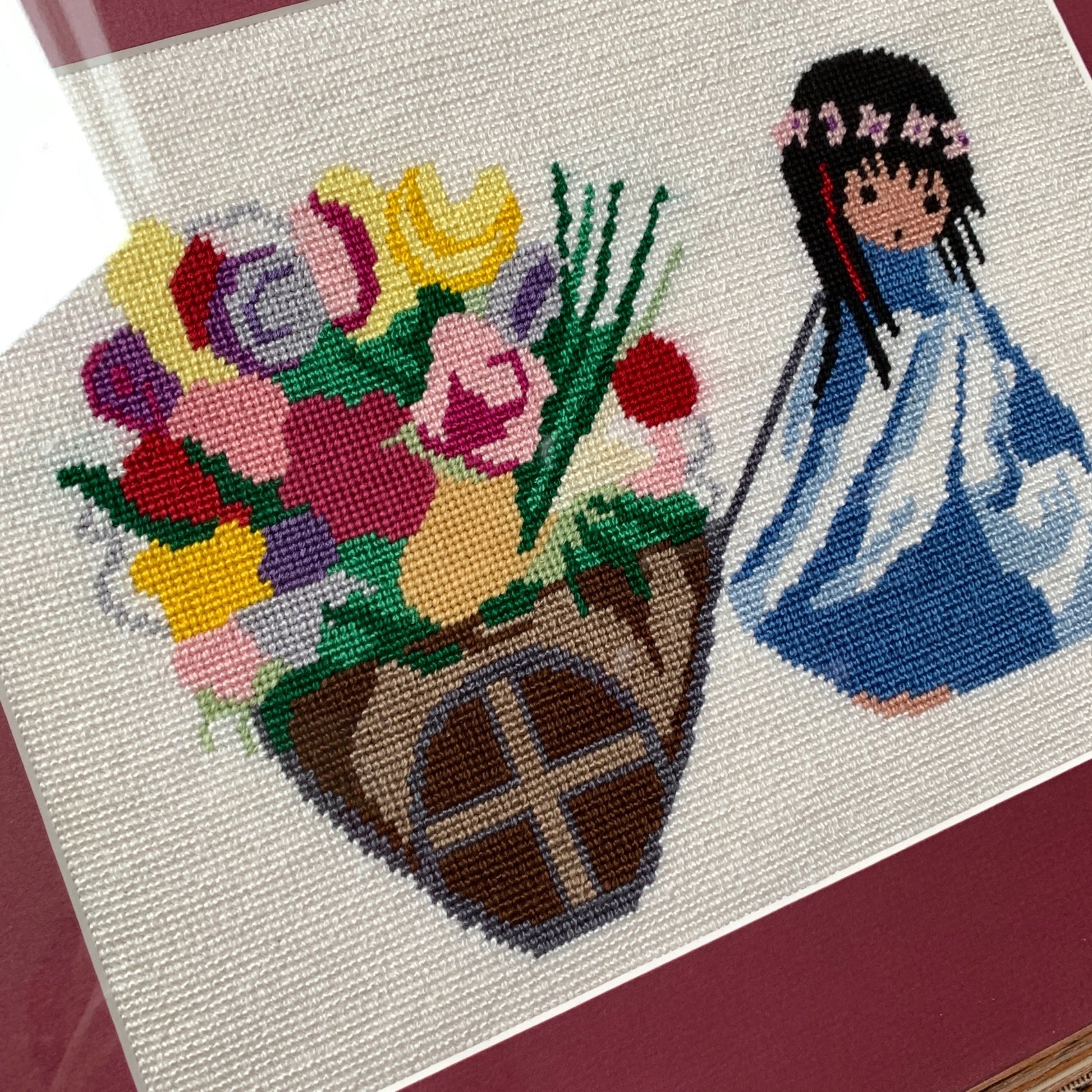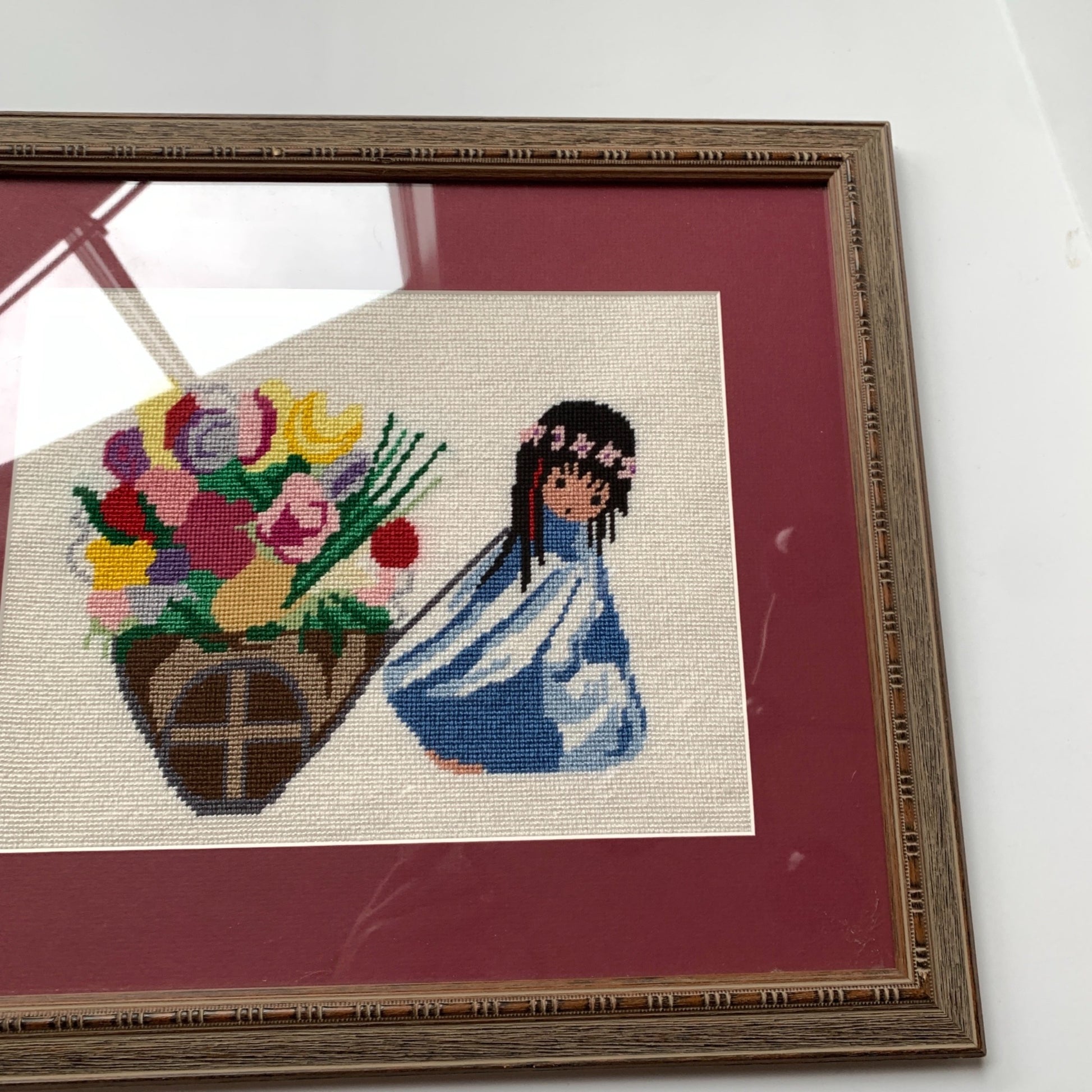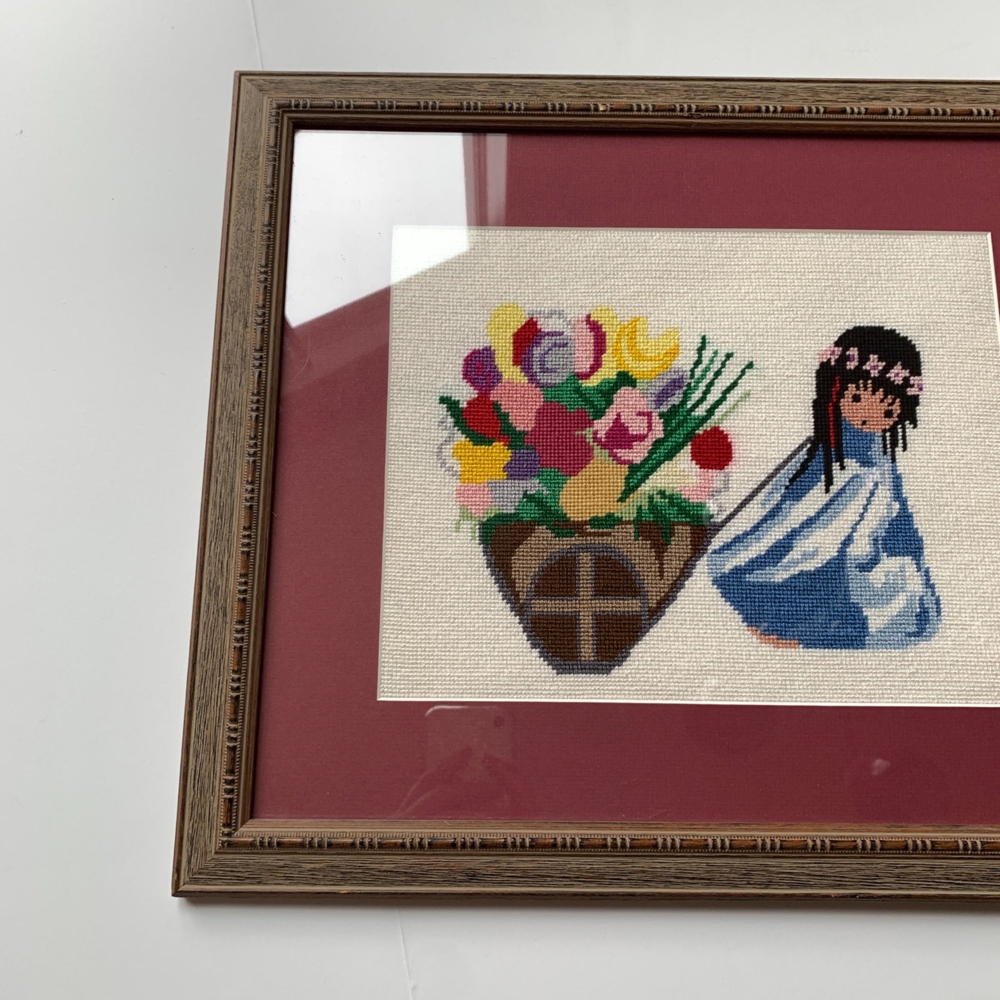 1970’s Framed De Grazia Needlepoint Native Girl with Basket of Flowers 18 x 15.25"