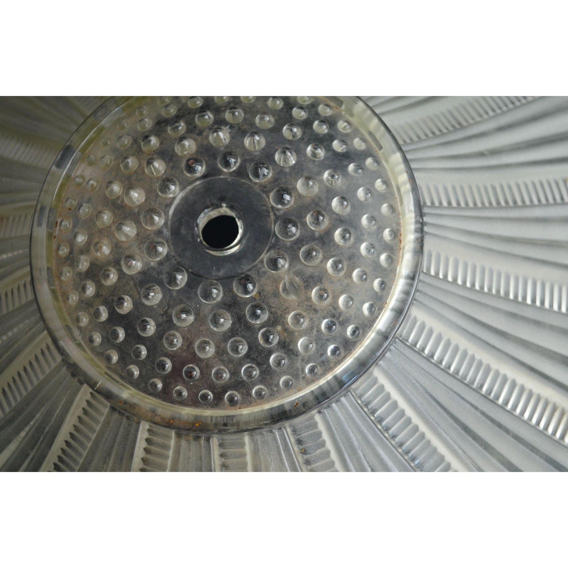 Awesome piece of history! Beautiful sunflower frosted glass light shade. It DOES have some chips on the edges and in the center hobnail section. Please view photos. This was a barn find and is a bit dirty from that as well. Will need to be cleaned before installation. 14" diameter petal to petal.