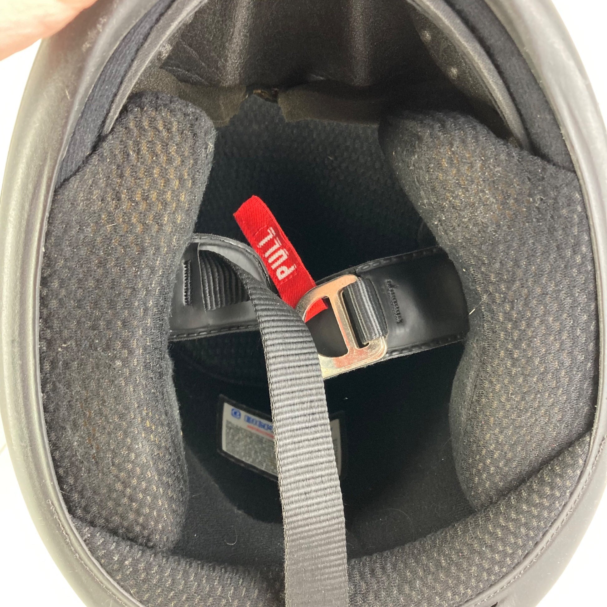 Helmet has some scuffs and scratches but nothing serious. Padding and buckle are in good shape. Visor has some scratches but nothing serious. Helmet is size XS.