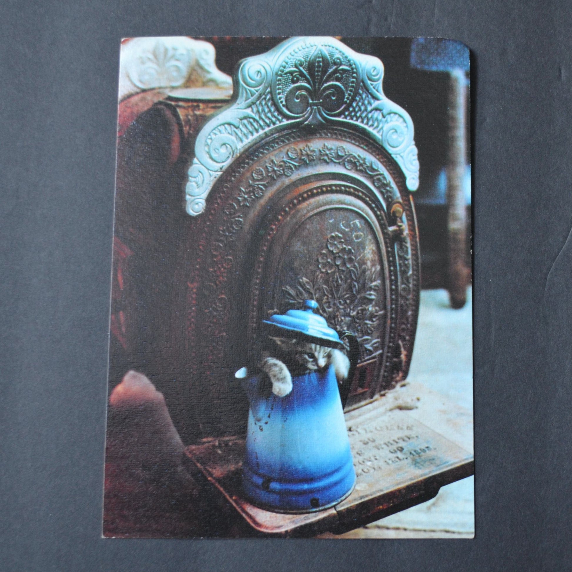 Just a little larger than postcard size. On postcard-thick paper. Measures 7" wide x 5" tall. Slight damage to corners and some sort of stain on back.