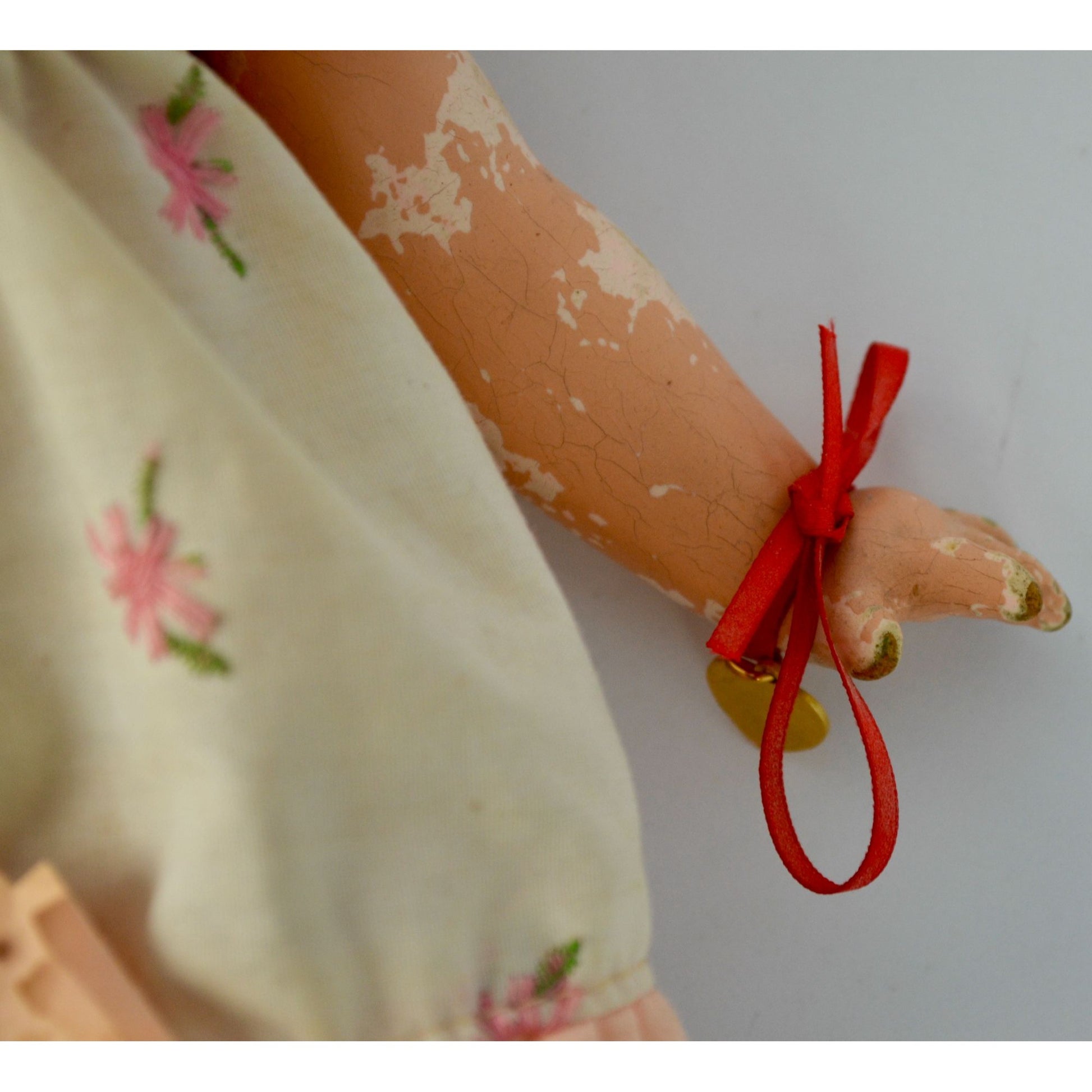 Doll has lots of damage and signs of wear. Please view photos carefully. Measures about 13" tall. I do not know if the clothing and accessories she is wearing are original to the doll but they are included.