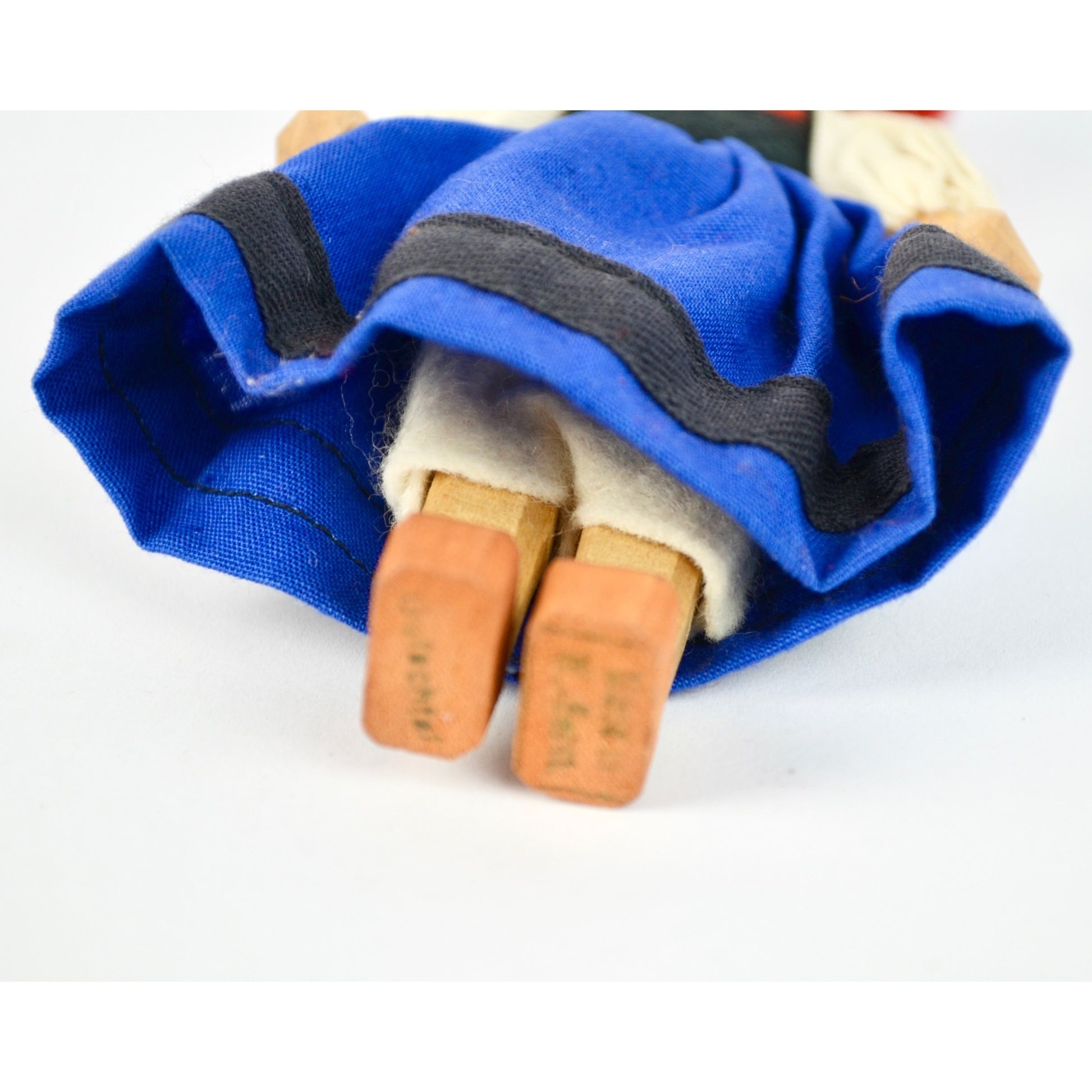 Handcrafted Wooden Doll With Traditional German Black Forest Bollenhut Outfit Red Pom Hat & Braided Hair Blue Dress