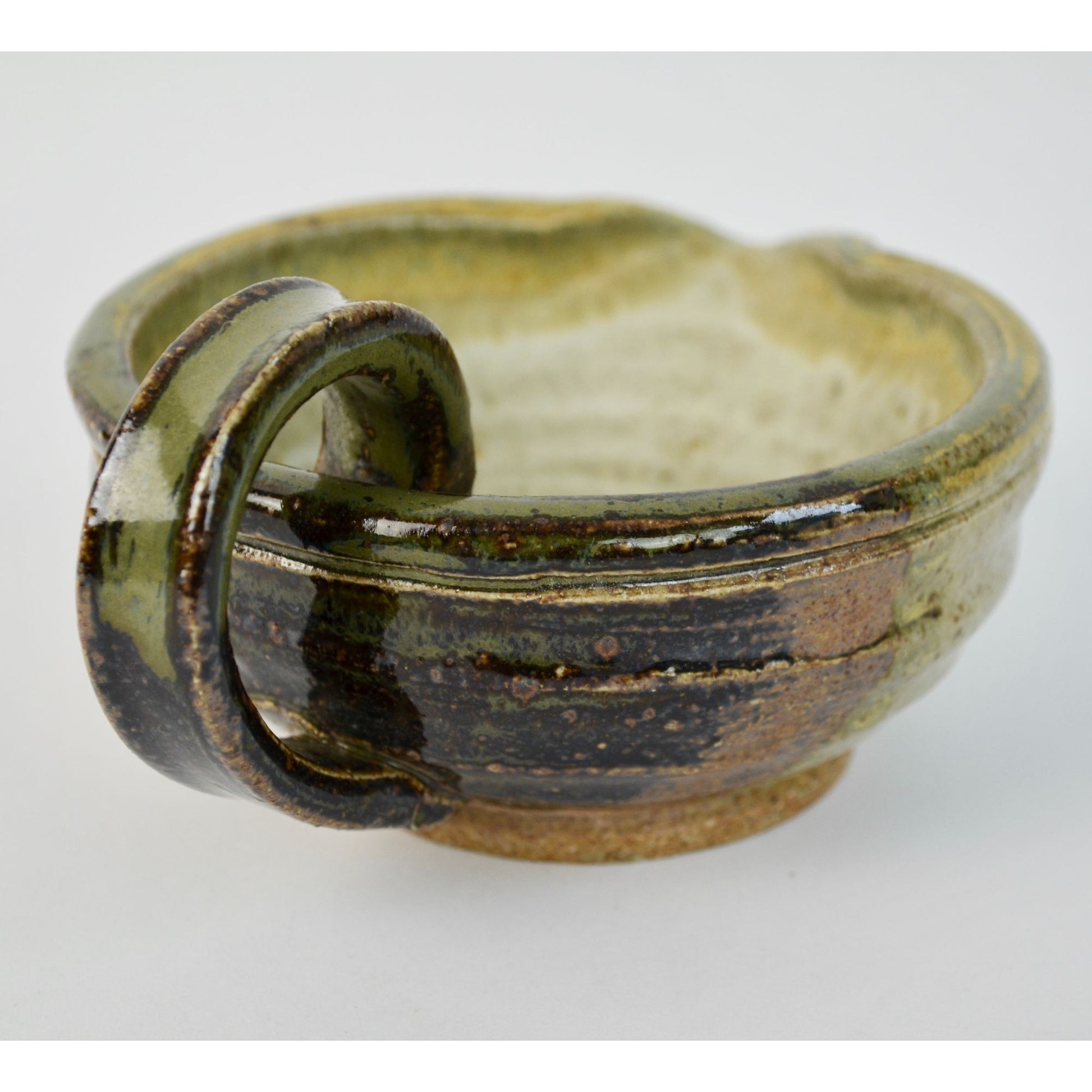 Very good condition. Signed by artist (unknown who it is as it's just initials). Measures about 2.25" tall x 5" diameter. Large decorative handle.
