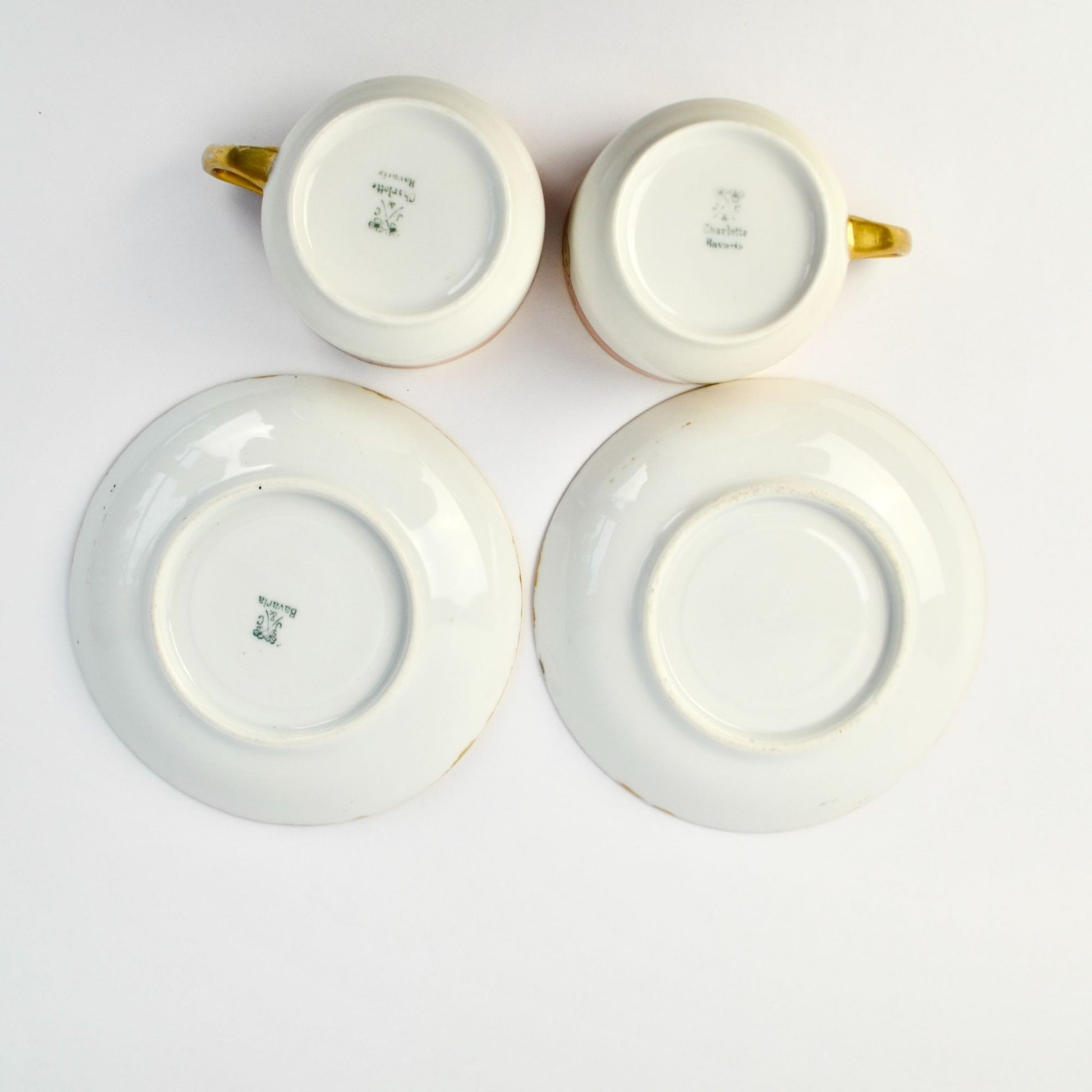 Set of 2 tea cups and 2 saucers. There is wear on the gold handles and trim. NO chips or cracks. Plates measure diameter of about 5.75." Cups diameter is 3.25" and 2" tall.