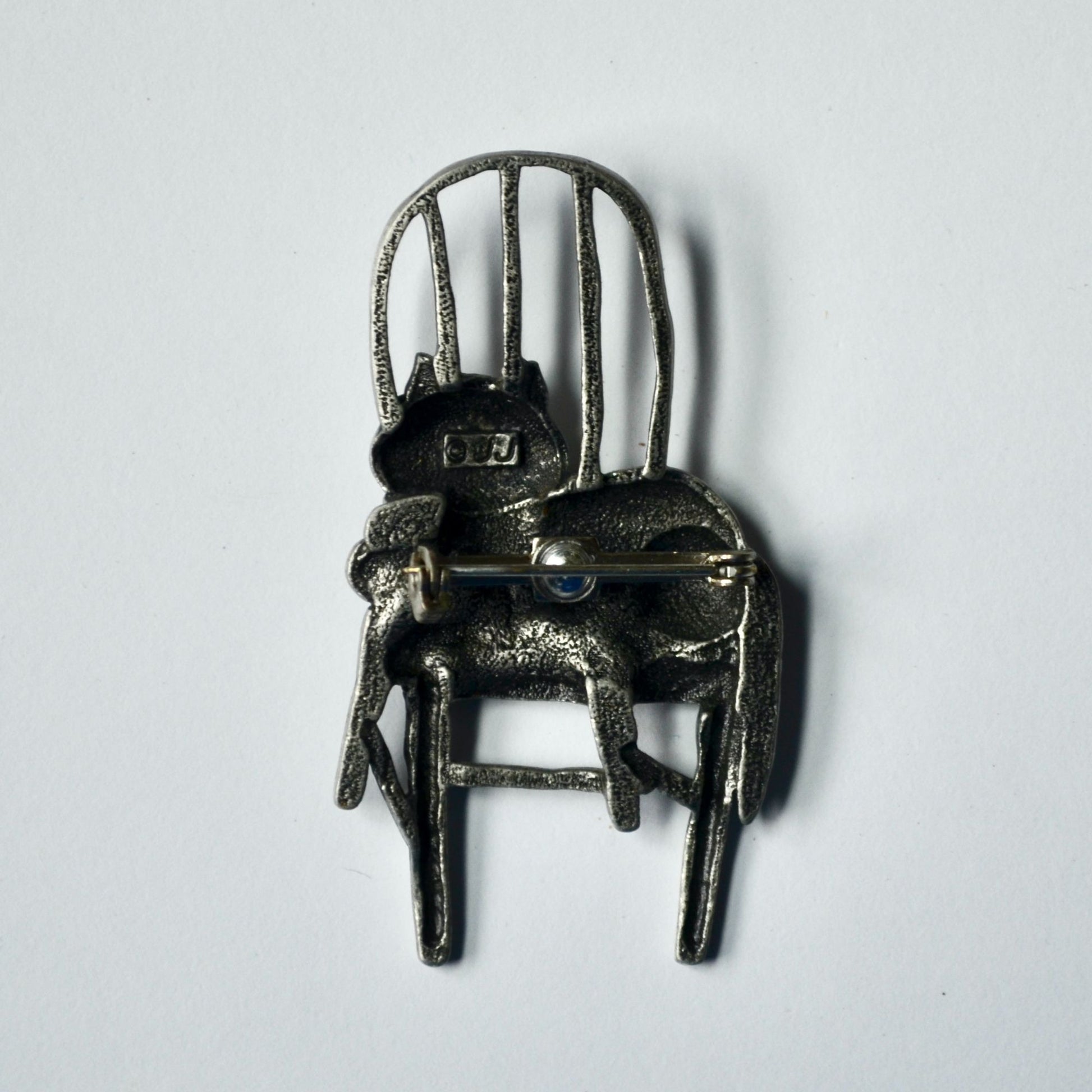 JJ Jonette Smiling Cat on Chair Brooch Silver Vintage