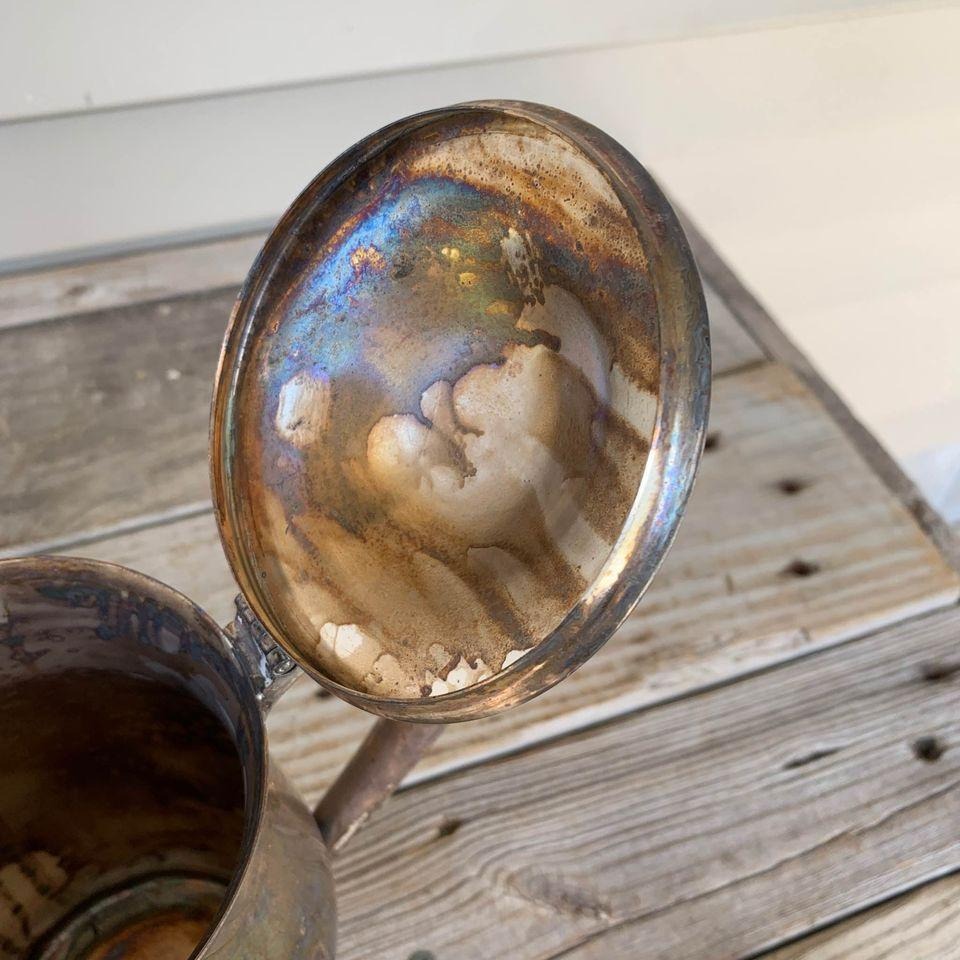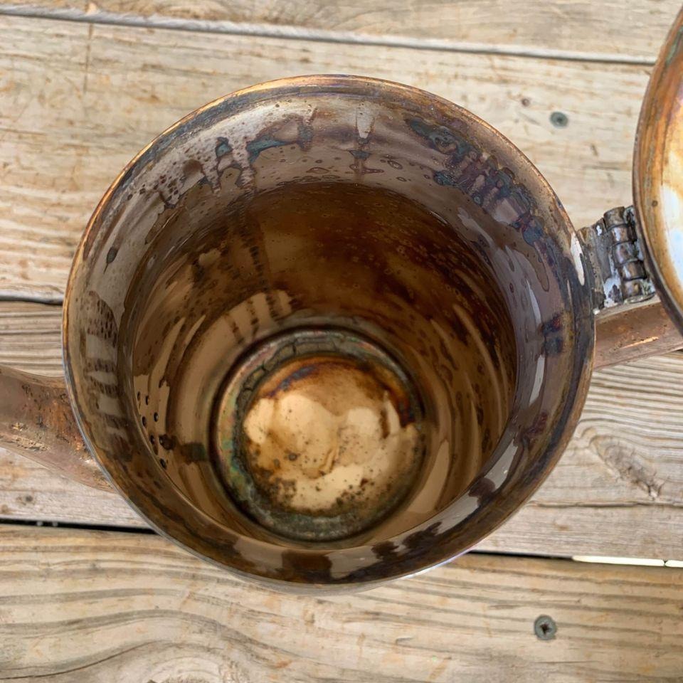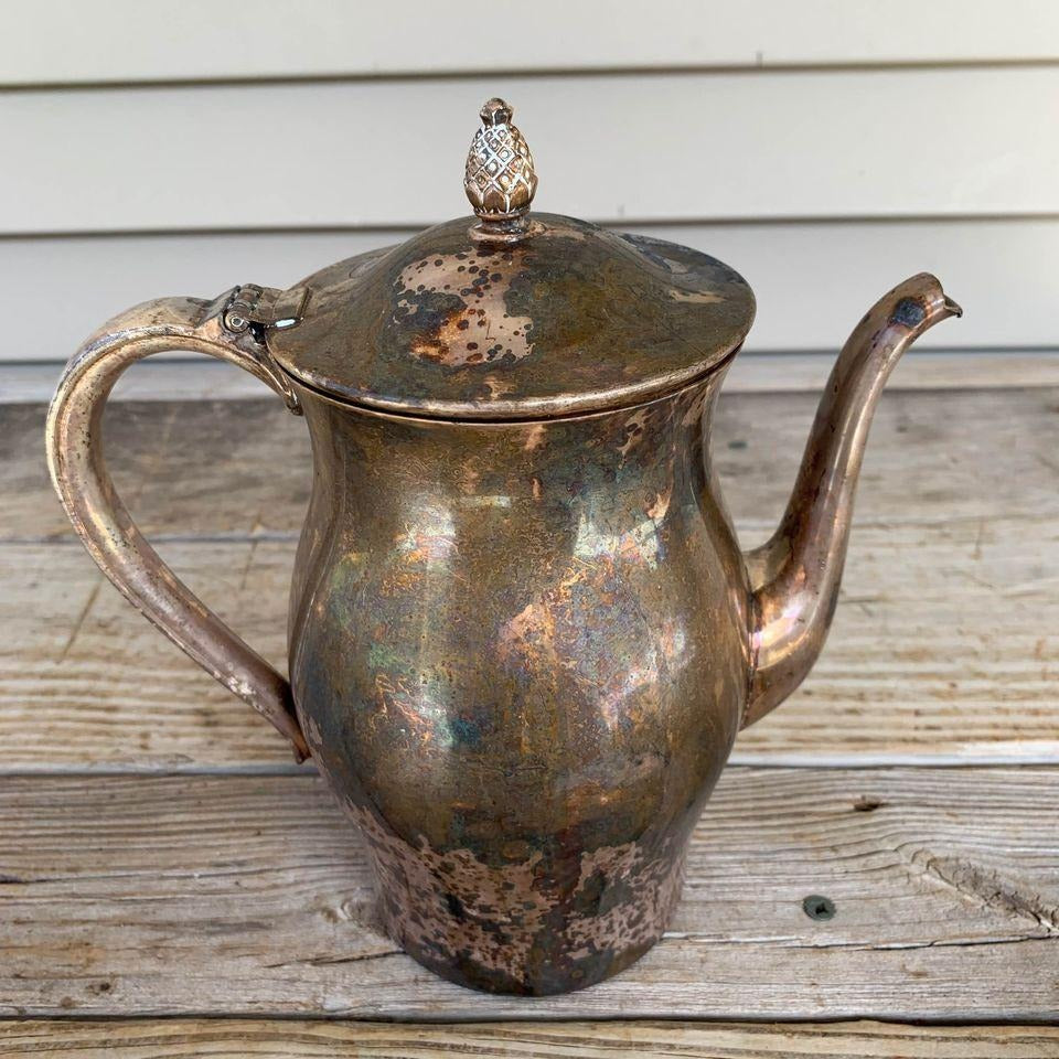 Needs to be polished obviously. Very nice teapot with just the tiniest cutest pineapple as the handle on top of the lid. Teapot total height is about 8.”