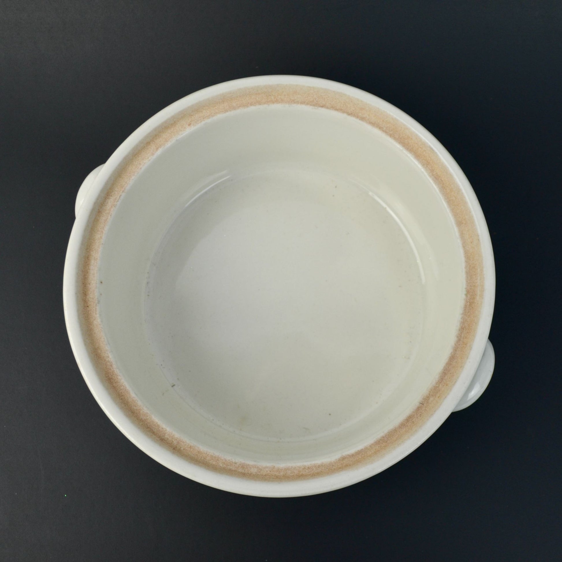 Some discoloration from use, otherwise very good overall condition. Glossy finish. Measures 8.25" total diameter, about 3.25" tall not including lid.