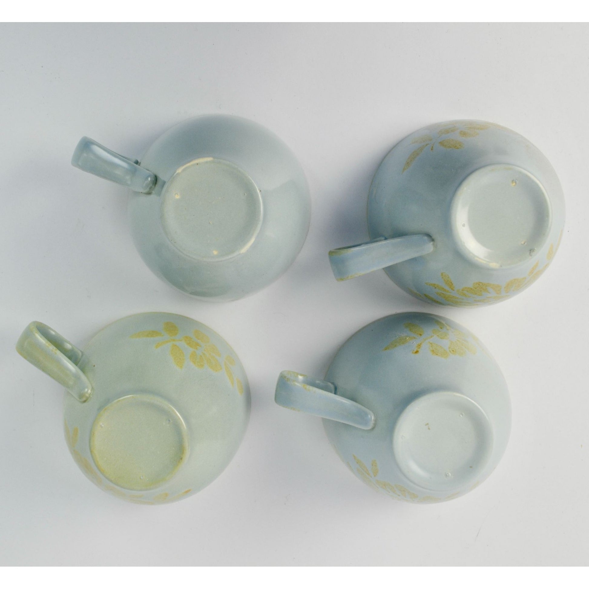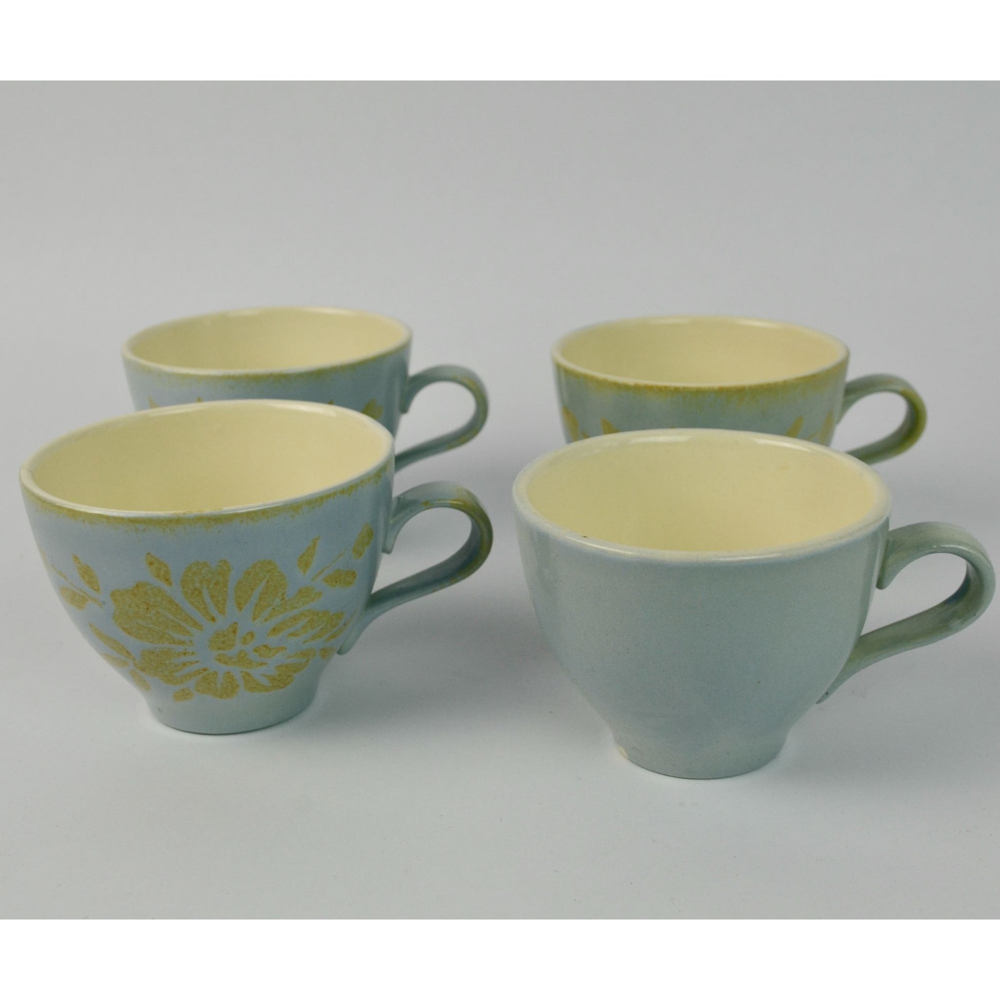Please note: one mug is just solid blue without the brocade pattern. The other three are matching. Measures 2 7/8" tall x 3.75" diameter. Very good condition.