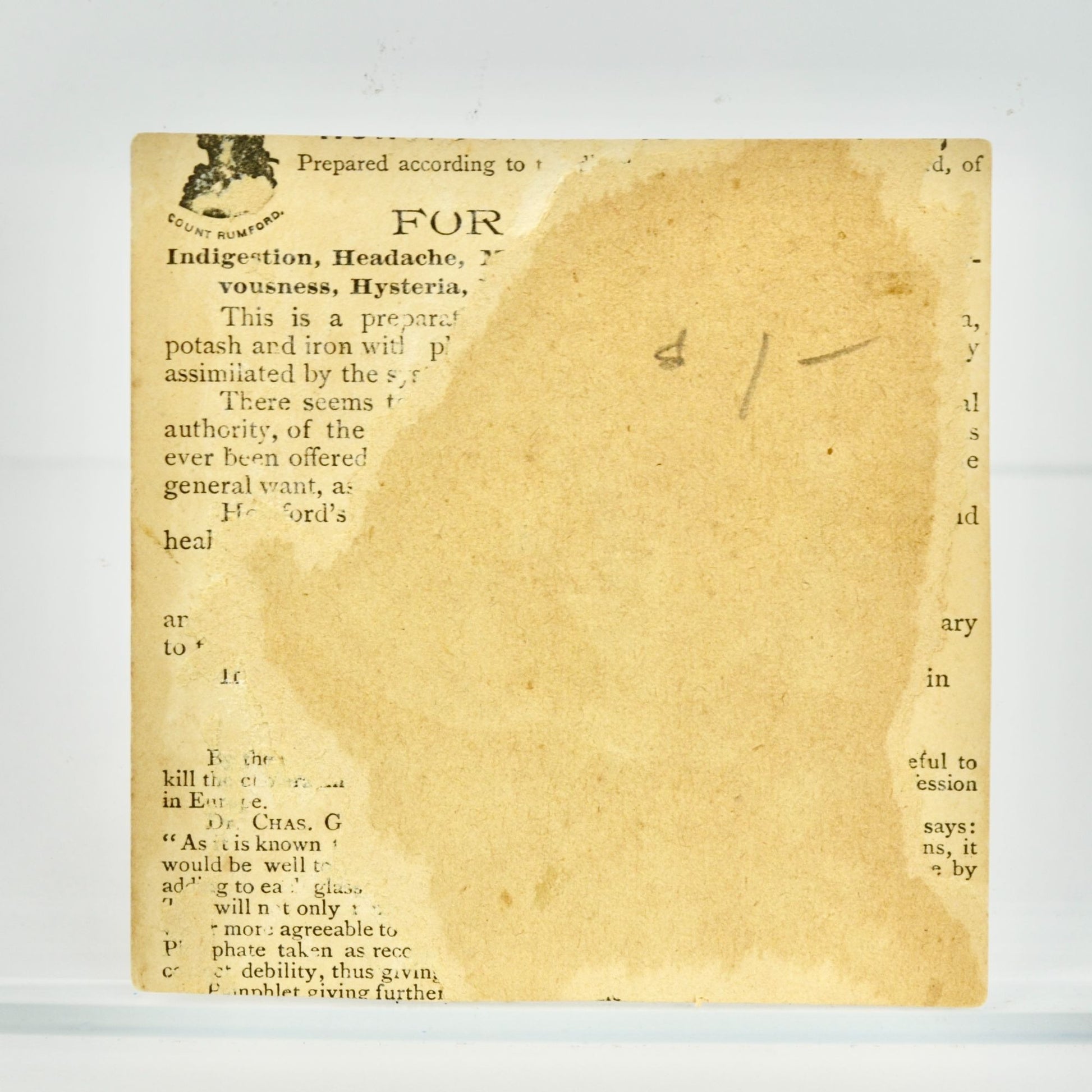 Torn on the back. Card measures 3 3/8" tall x 3 3/8" wide. Top of card also is missing that mentions the brand name.