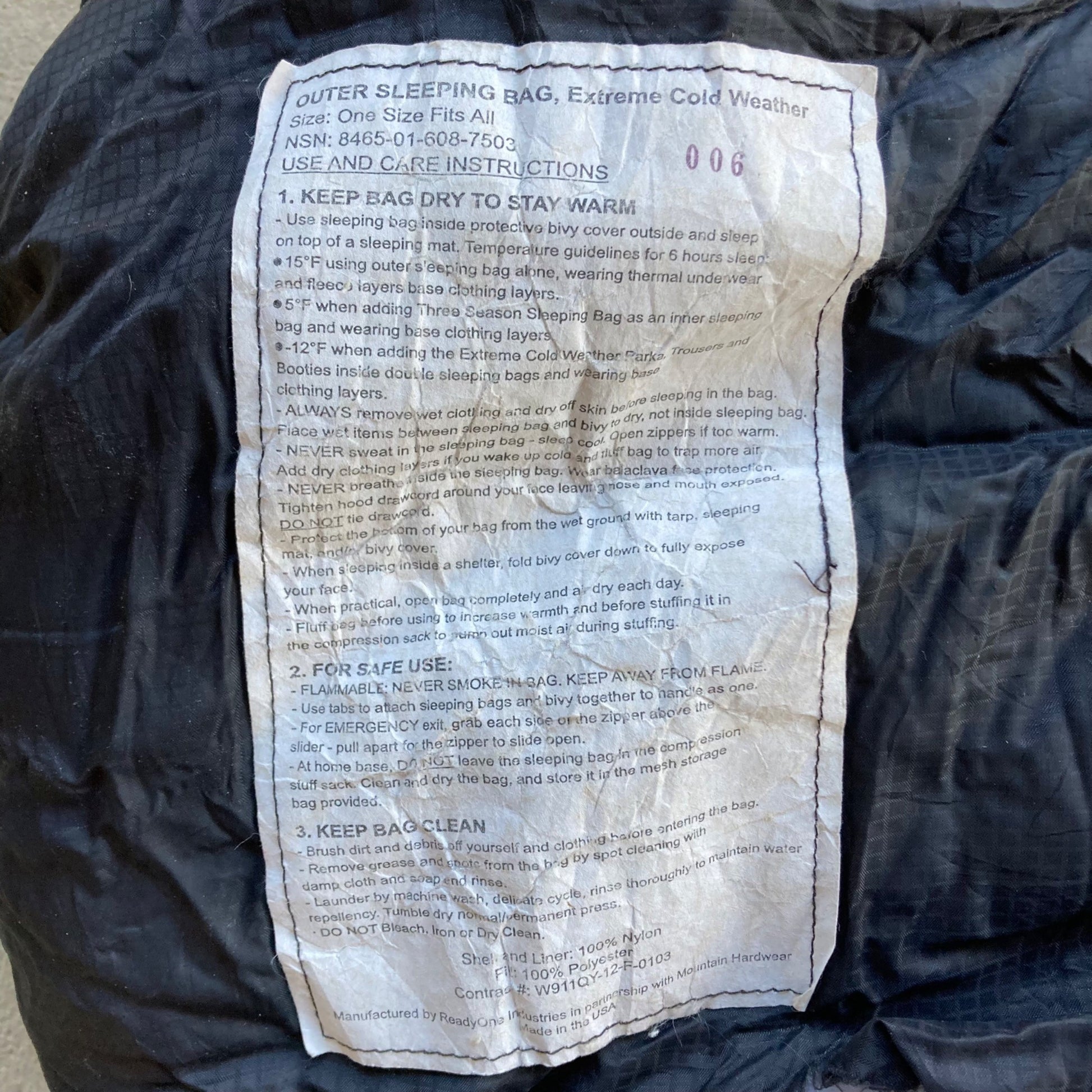 US Military Outer Sleeping Bag Extreme Cold Weather Black Army HAS A TEAR