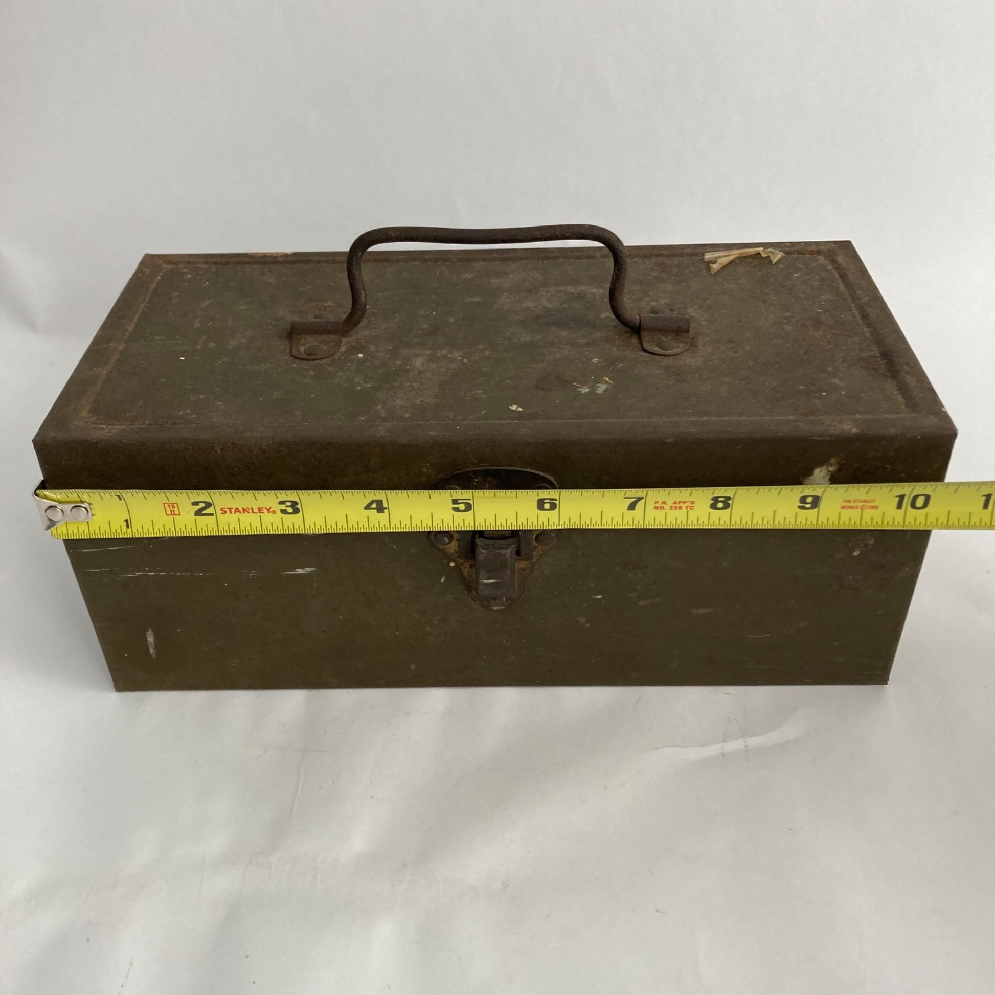 Vintage 10.5" Box Military OD Green w/Tan Belt & Lubricating Oil Can 2 oz Poison