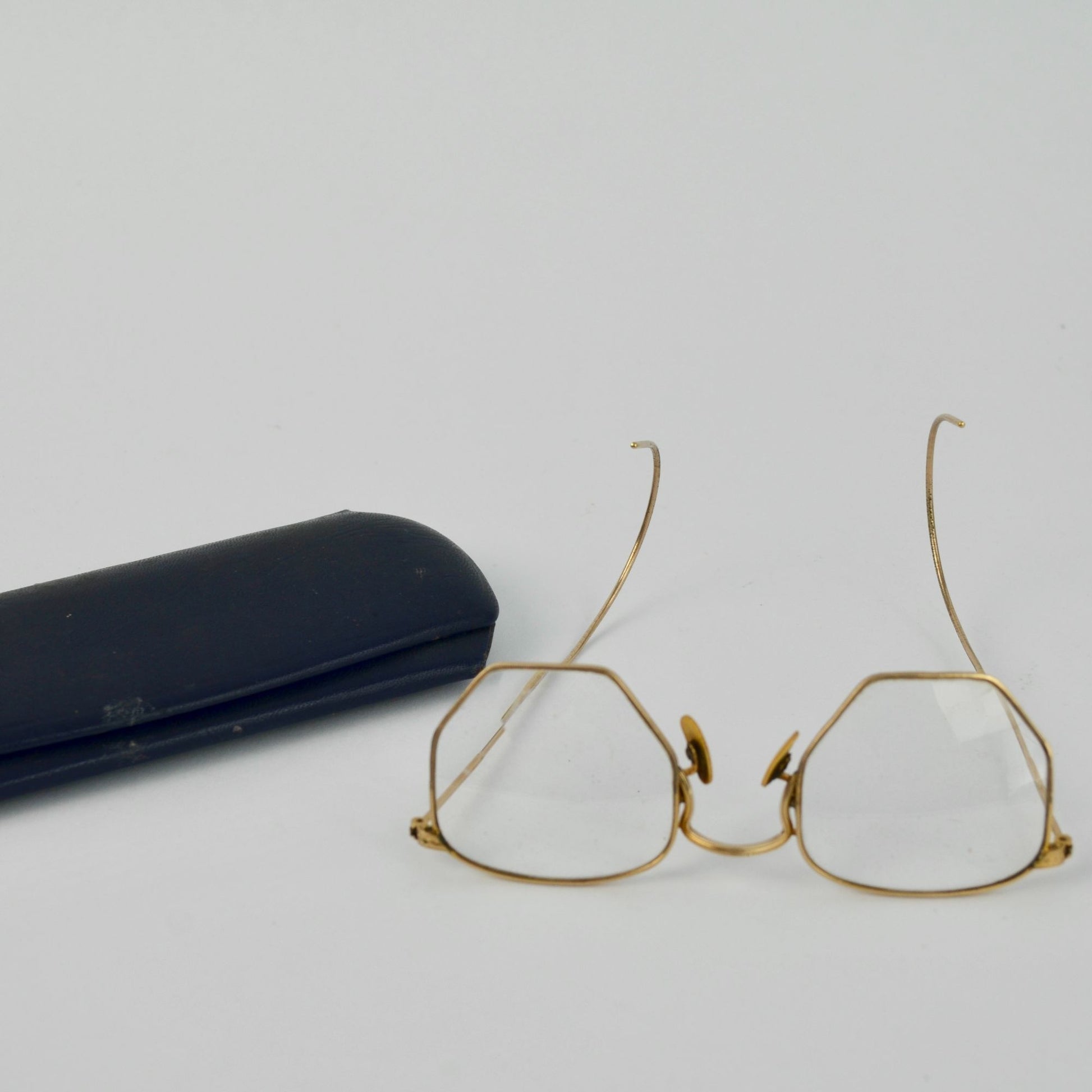 Glasses have a few marks on the lenses and show some general wear/aging. Marked AO 1/10 12KGF on the inside of the bridge. Comes with the shown case.
