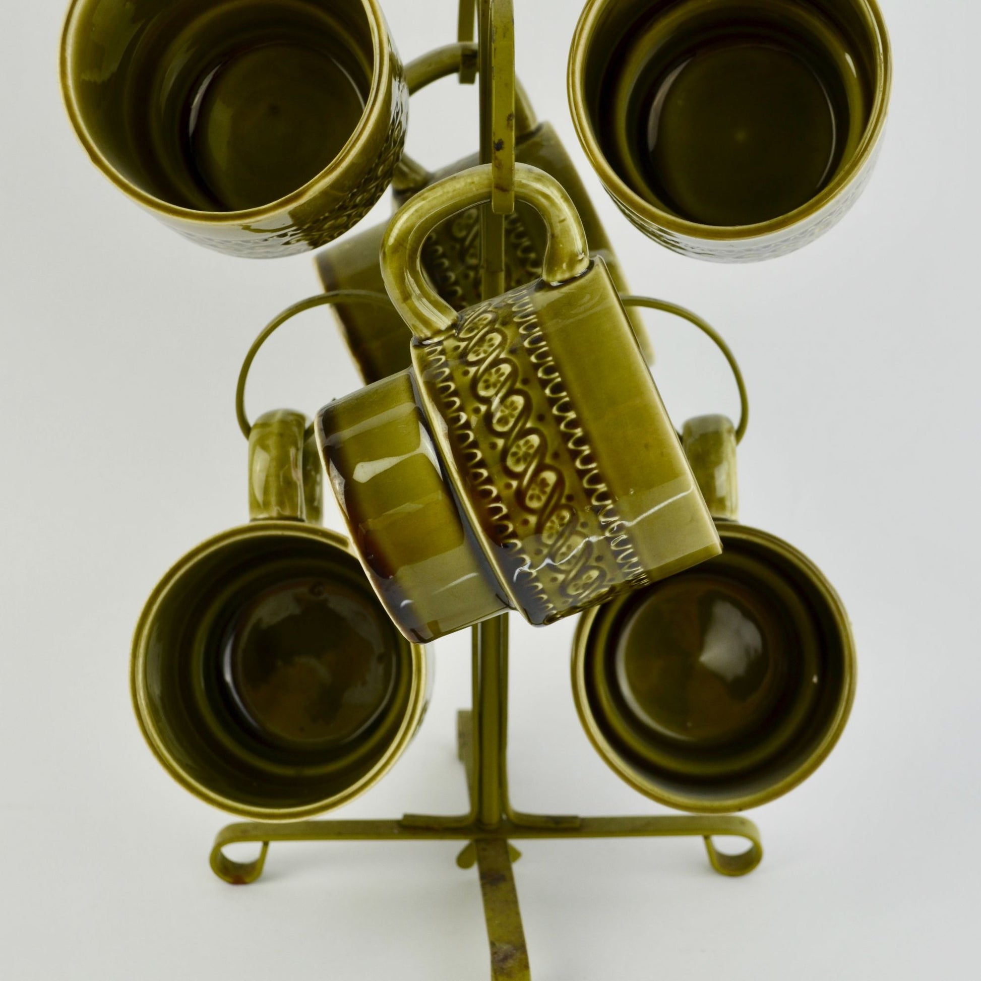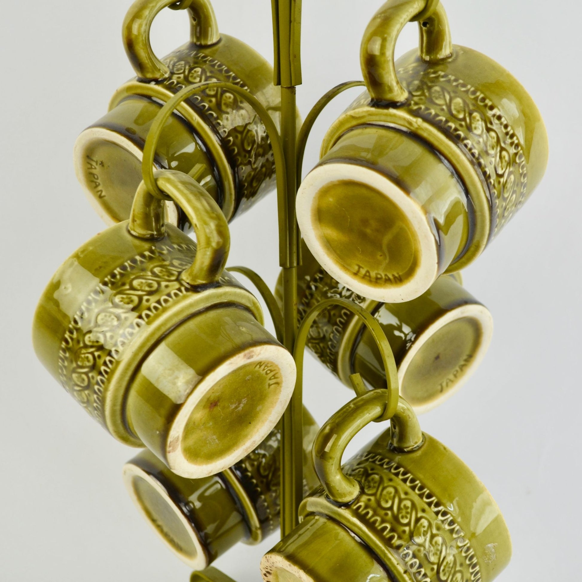 Vintage Avocado Green Japan Coffee Mugs Set of 6 With Storage Tree