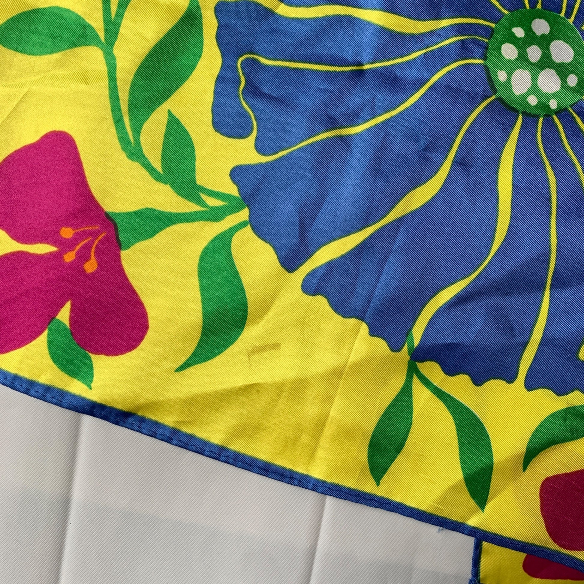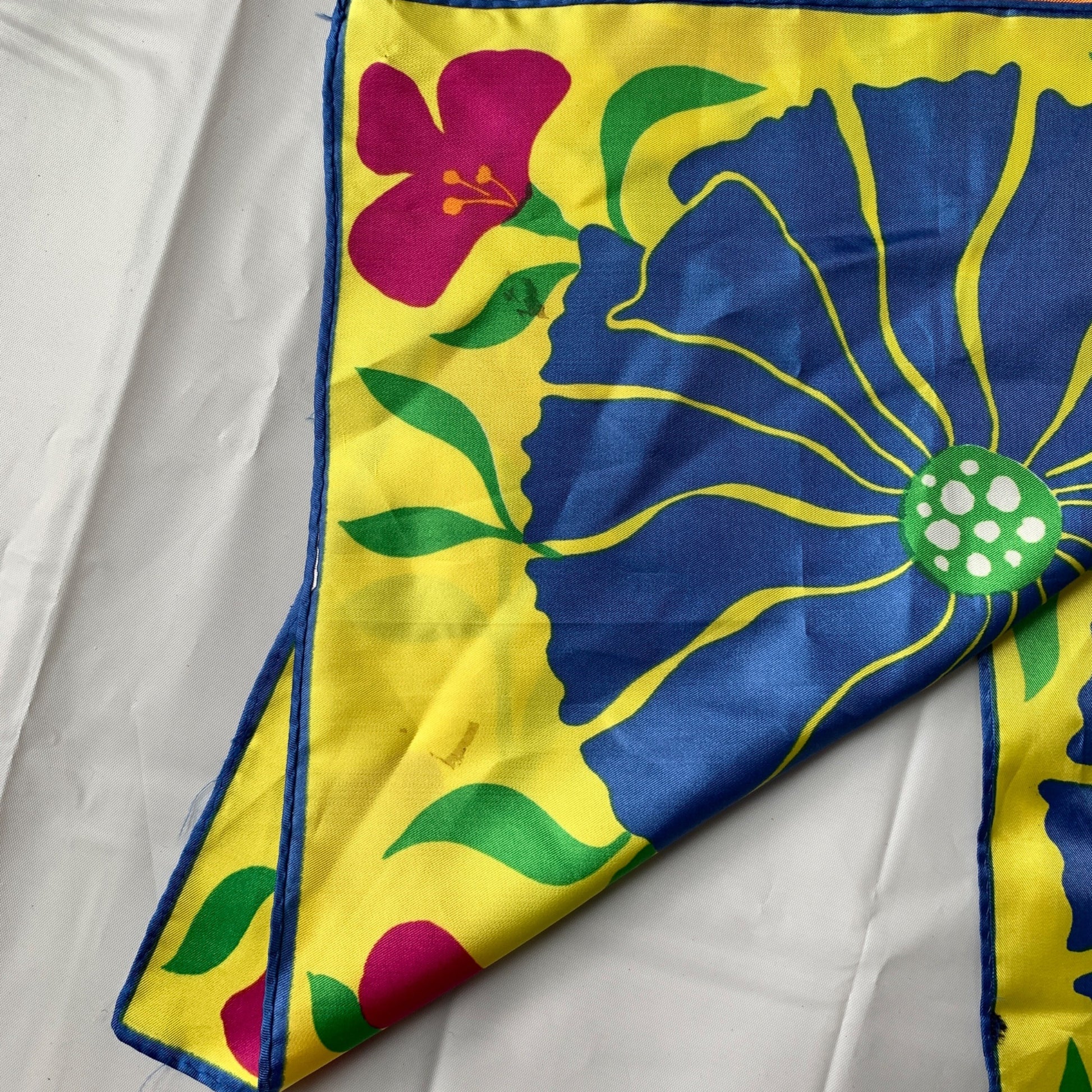 Unknown brand or material. Beautiful bright colors. Good condition, does have a couple spots from sticker residue. Measures 52 x 13."