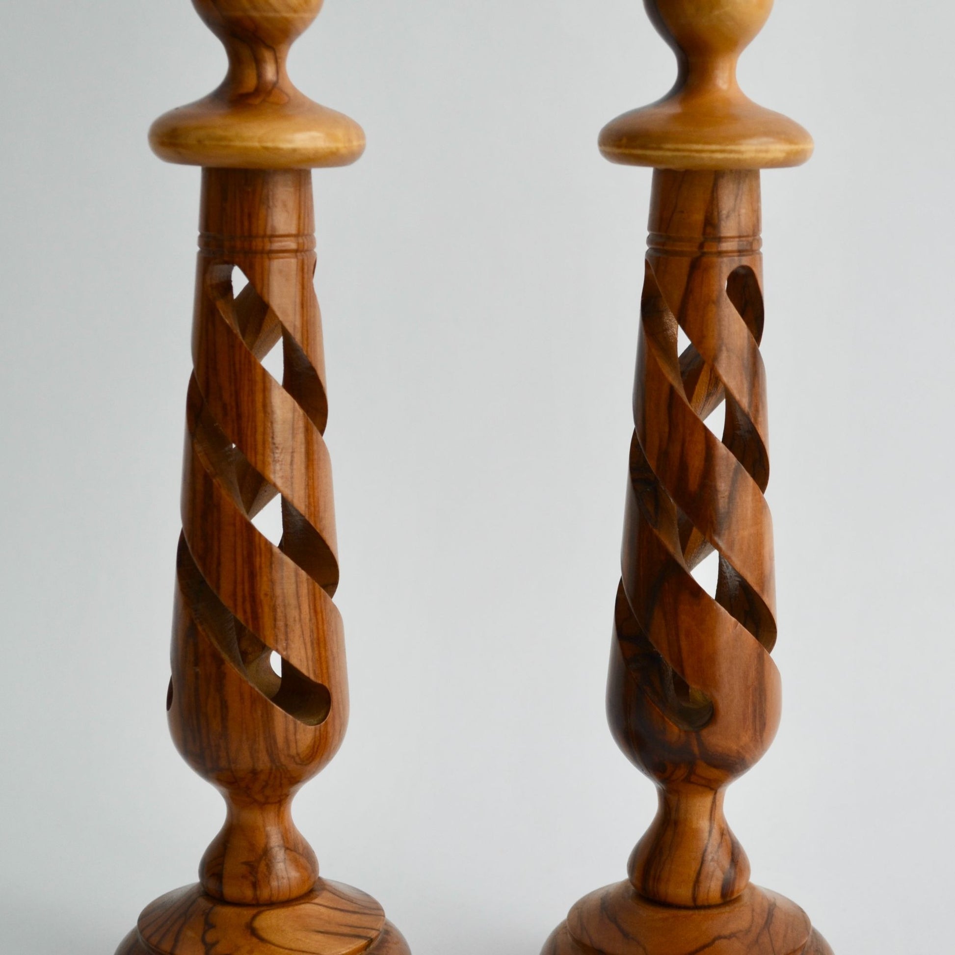 Vintage Hand Carved Wood Spiral Candlestick Holders Pair Mid Century Modern