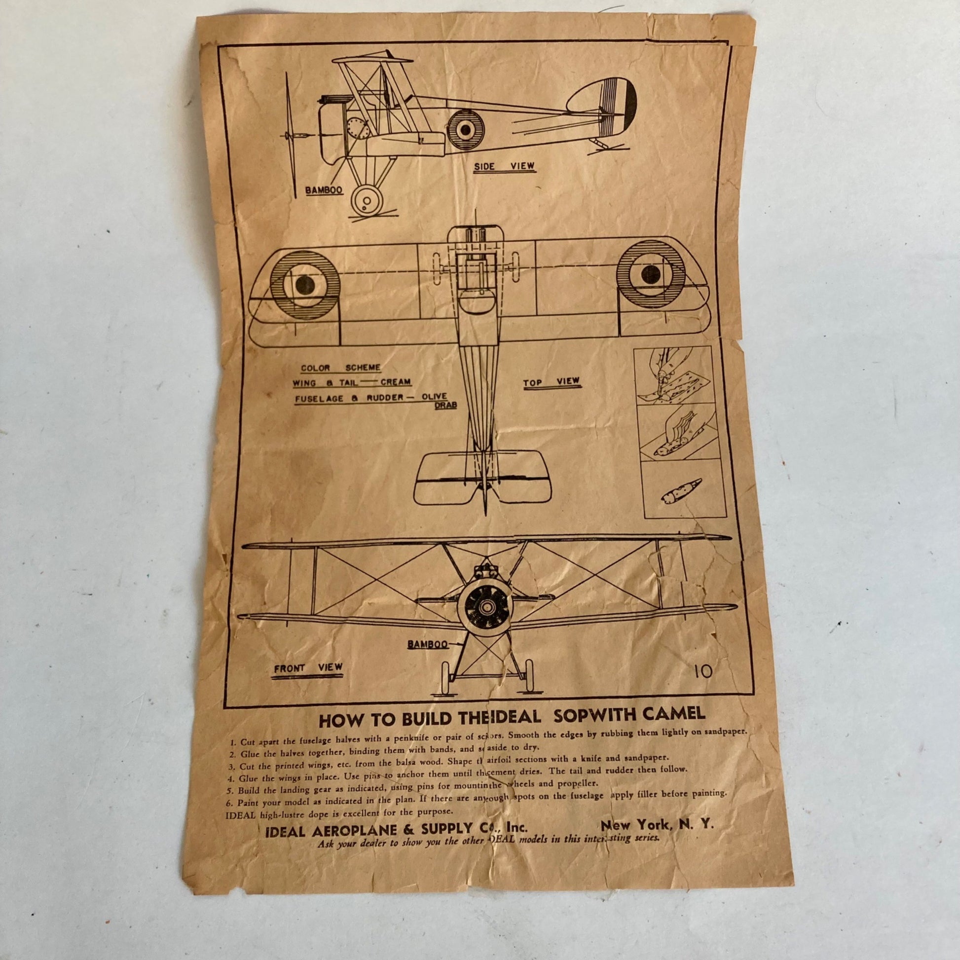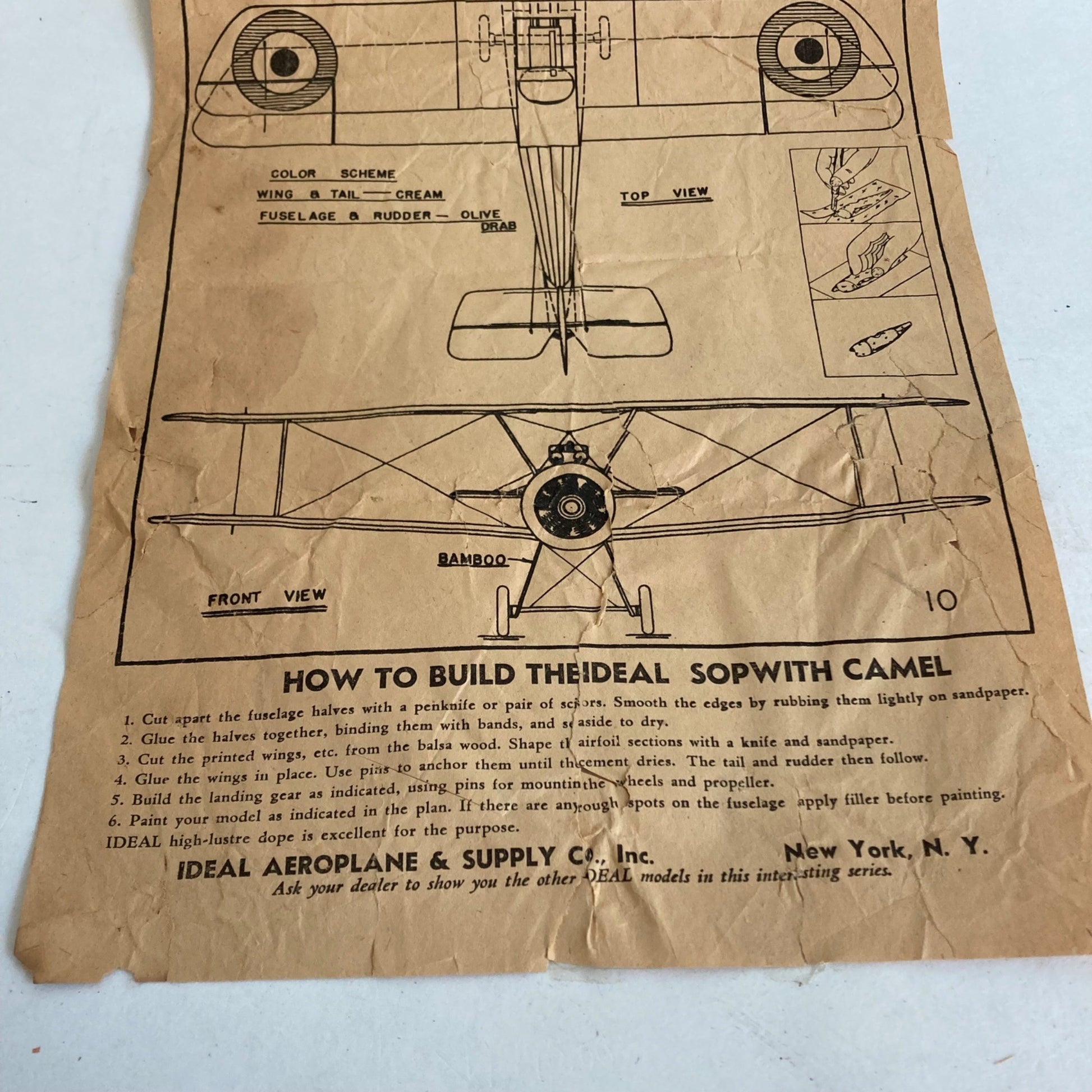 Vintage Ideal Aeroplane & Supply Co Sopwith Camel INSTRUCTIONS PLANS Antique