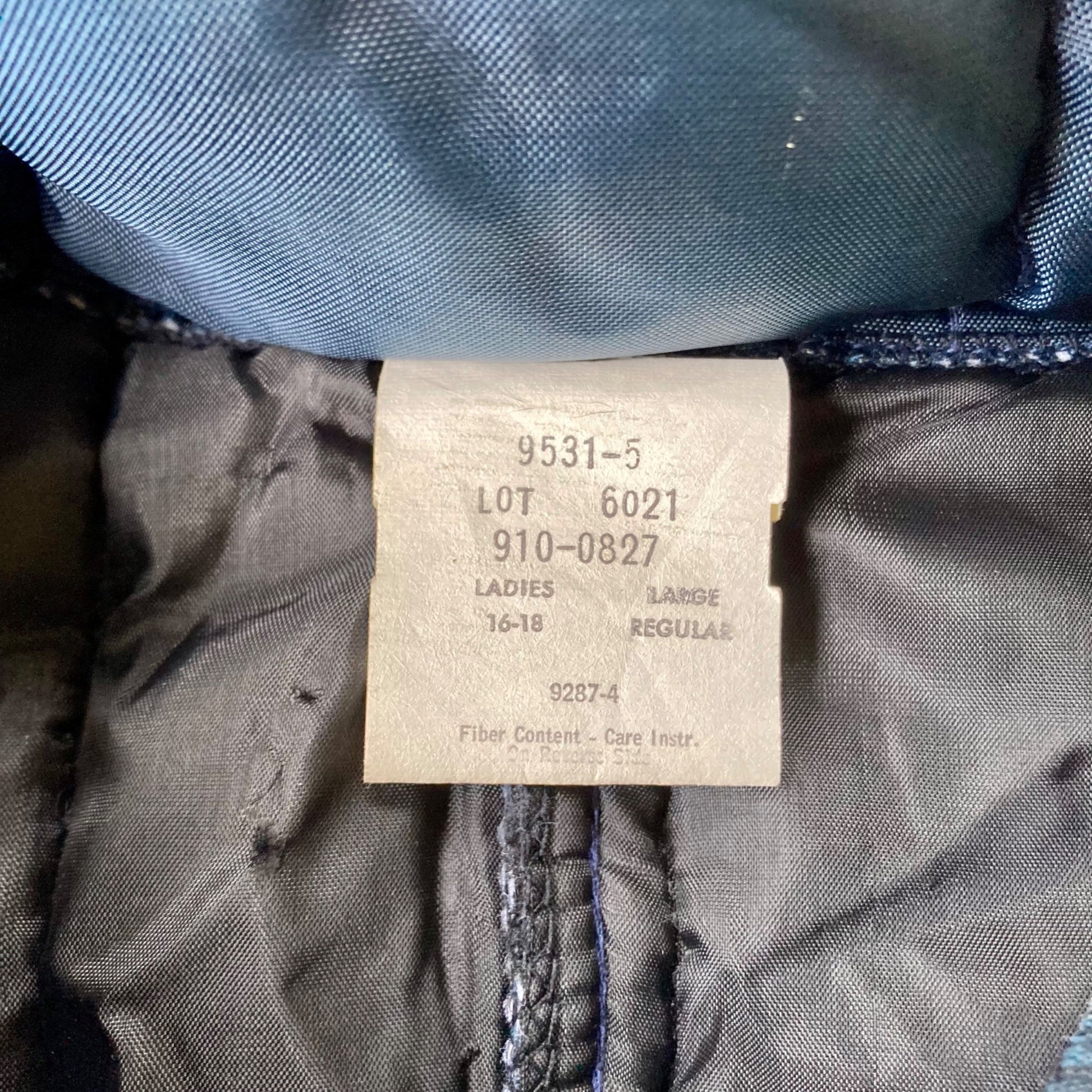 I don't see a maker's mark anywhere, but I believe it's a JC Penny snowsuit. There is a tiny bit of fraying on the bottom edge of one of the legs, otherwise snowsuit is in excellent, clean condition. Hardly looks worn. This is a Women's size Large-Regular 16-18.