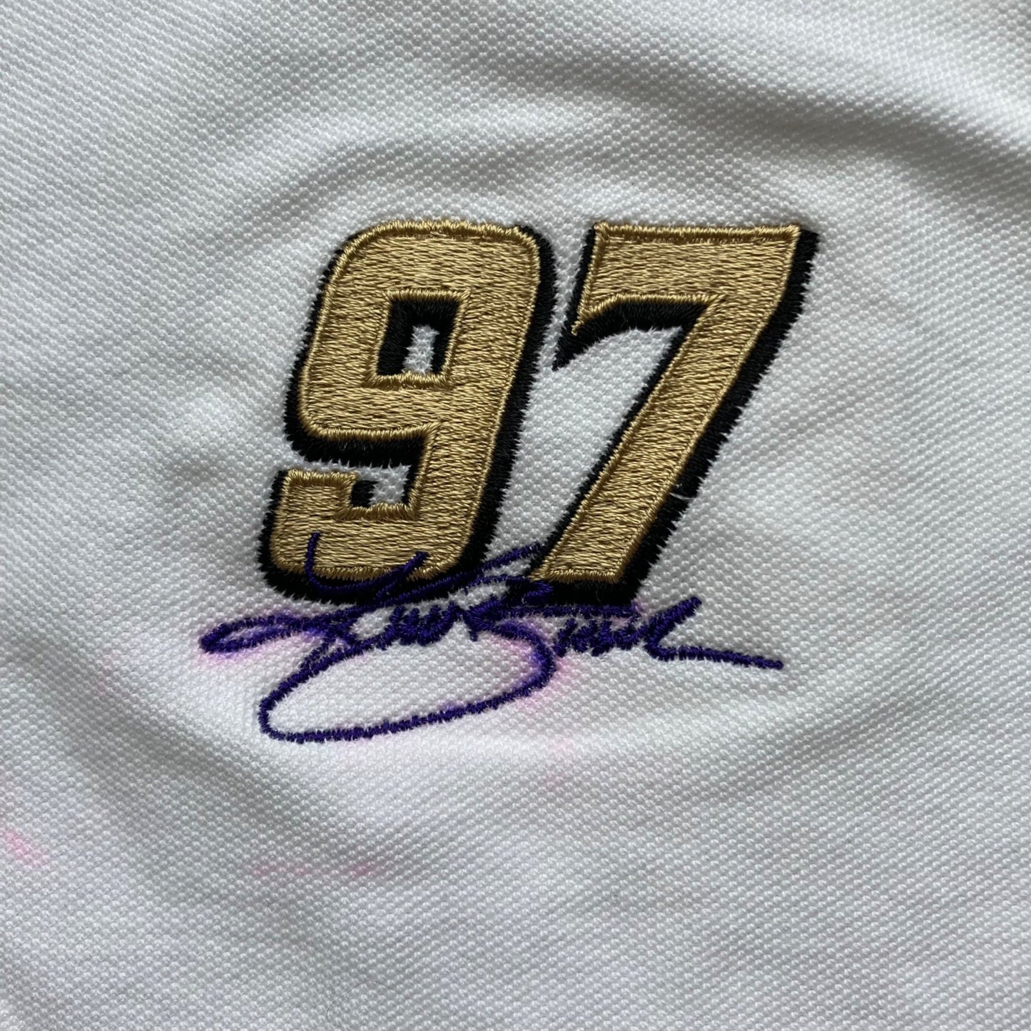 Shirt has one small mark just under the right collar and the Kurt Busch signature is "bleeding" a bit into the white, otherwise in good, clean condition. Women's size S.