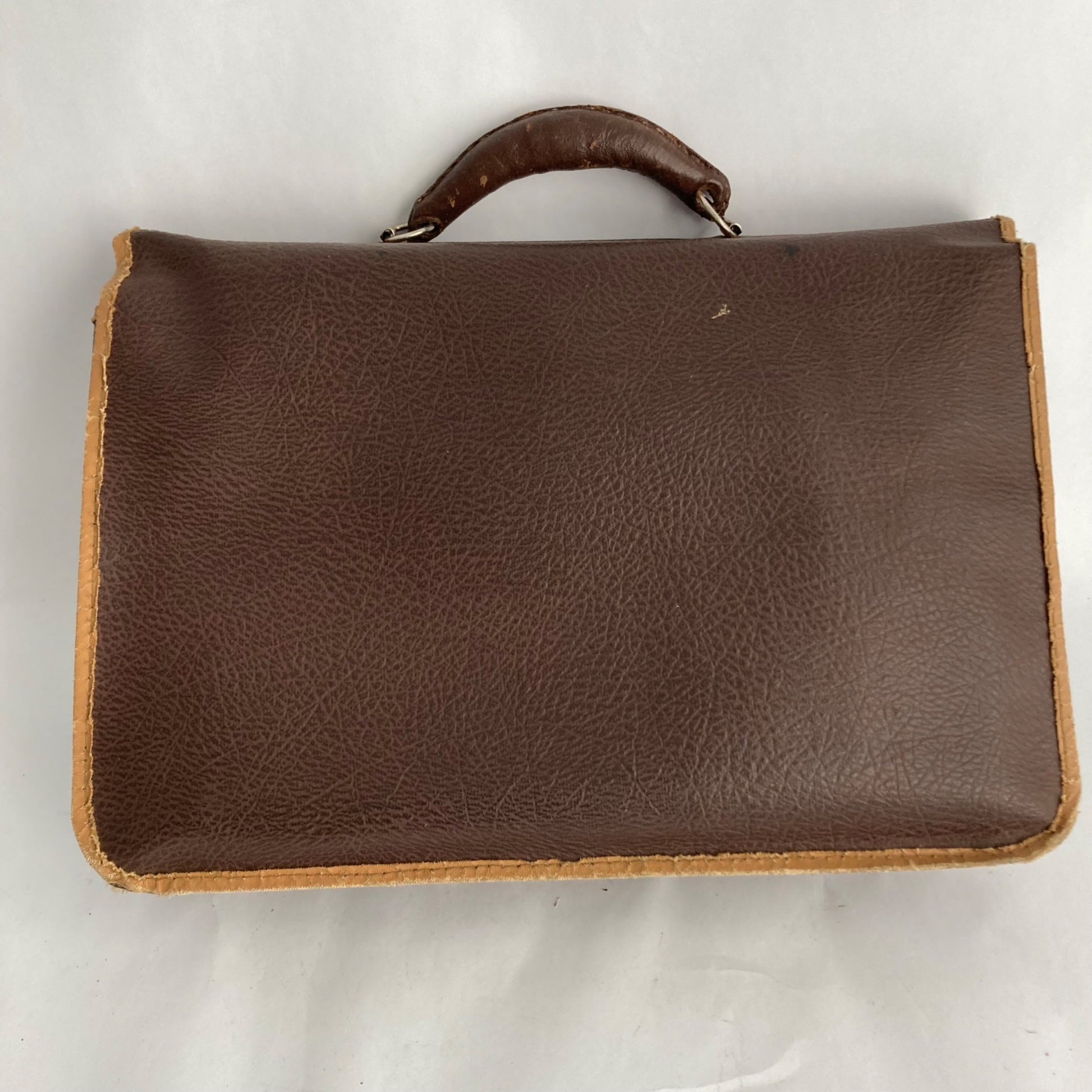 Bag is older (had paperwork from the 1940's in it - not included) and shows wear, especially along the edges. Has someone's name printed on the bottom-right corner (see pic). Leather is stiff from age (possibly not even real leather?). Cool, vintage bag nonetheless.