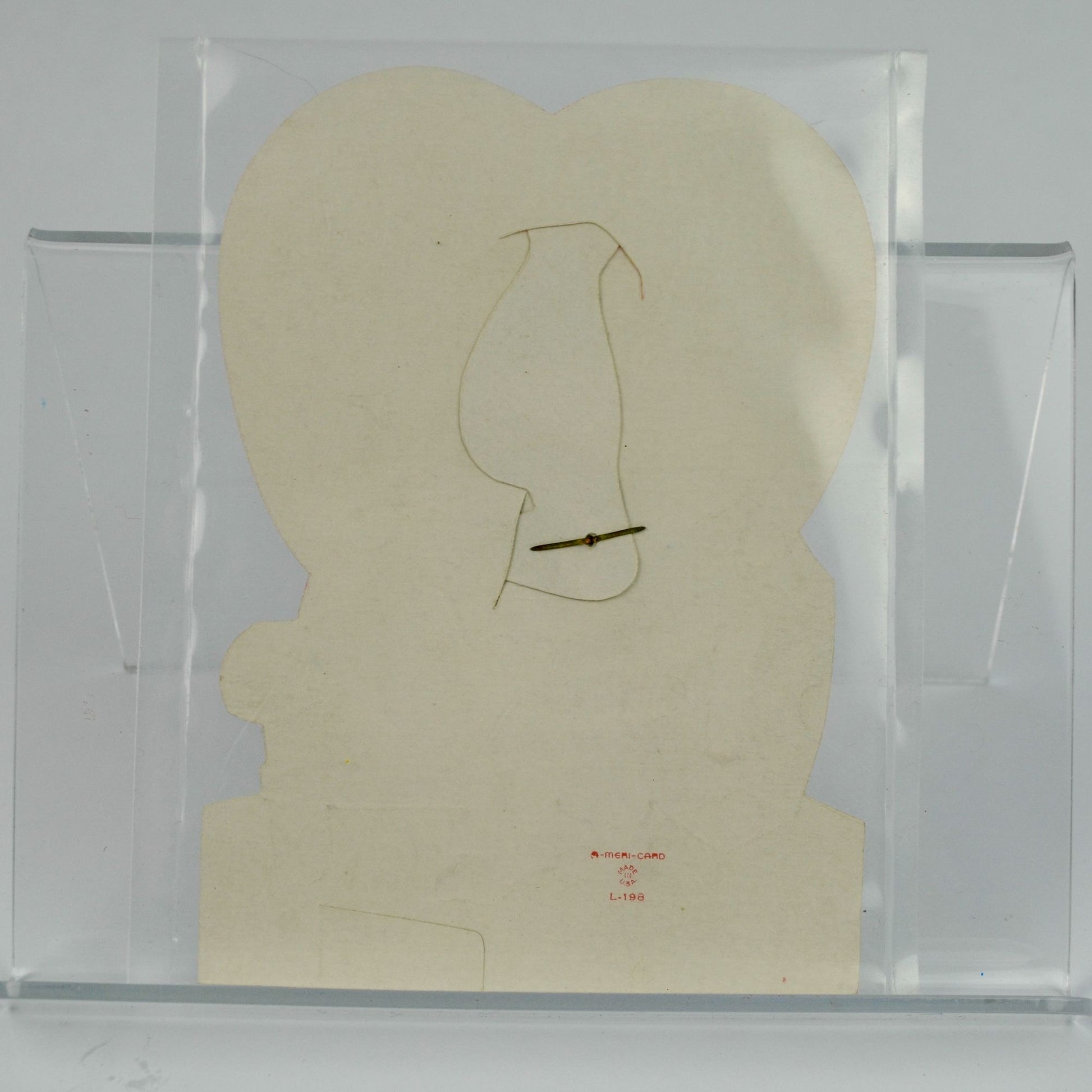 Good condition. Stored in sealed plastic as shown. Arm moves. Measures 6.25" tall x 4.5" wide.