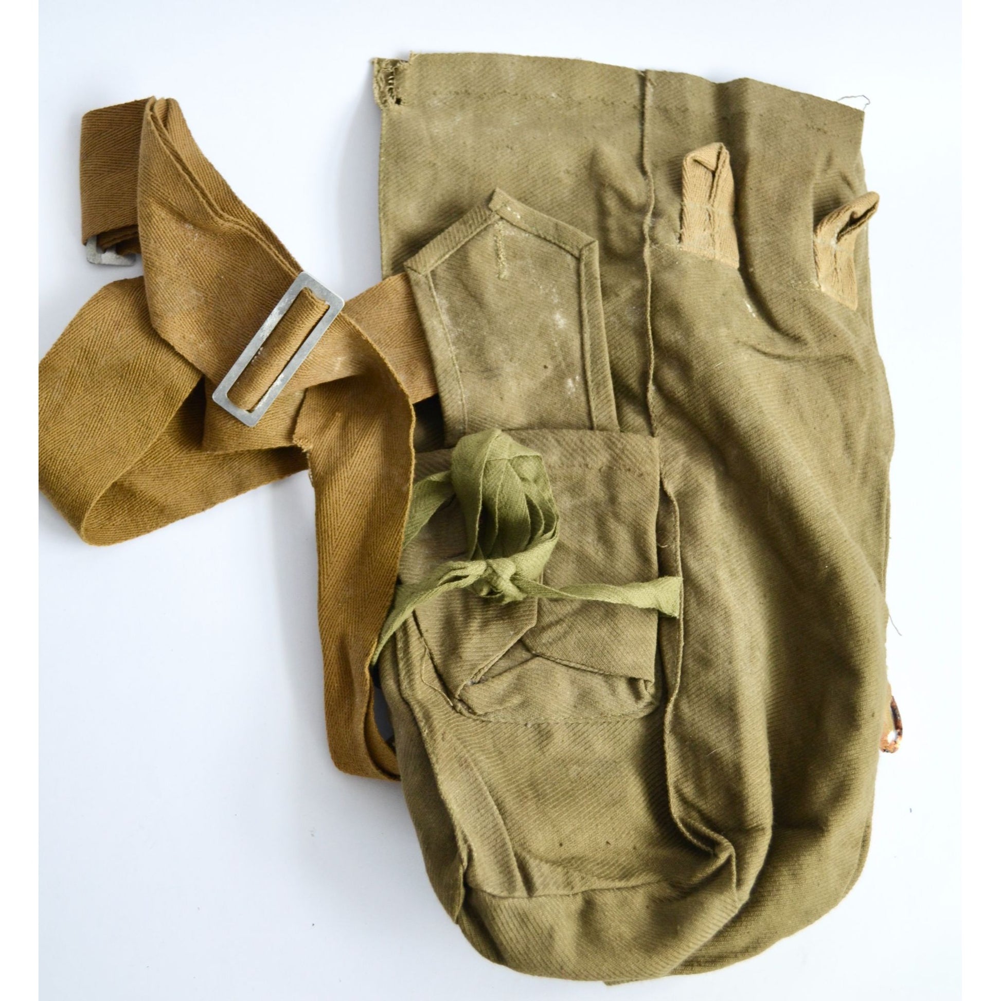 Just in time for WWIII, here is a Soviet cold war era gas mask for all your needs. Gas mask shows some normal wear and age but in decent shape. Not sure on the size, but seems to be on the smaller side. Canister looks newish. Bag shows some wear and aging (has a small tear in the top and metal D ring is very rusty). Cool, old gas mask!