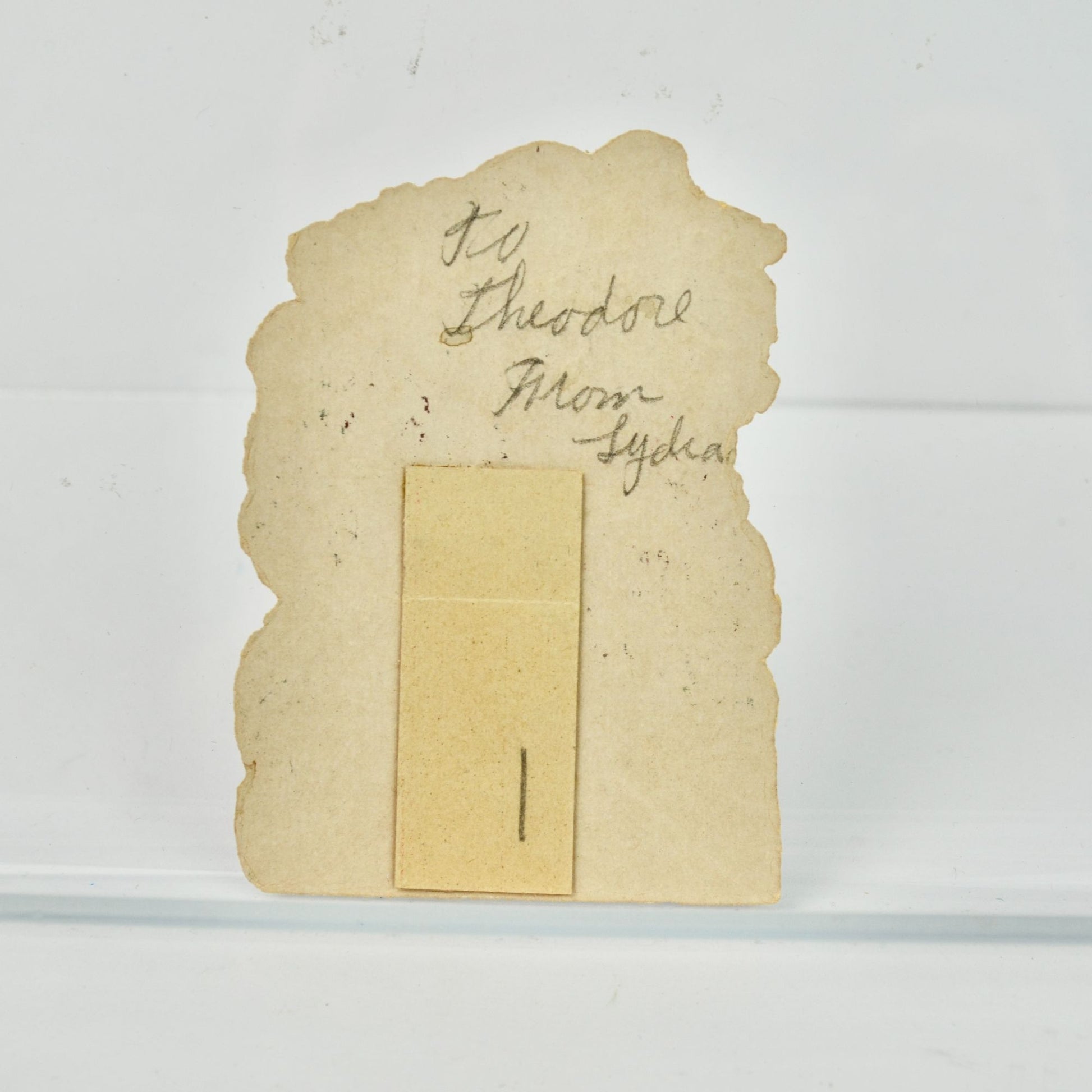 Does have writing on back. Overall good condition for age. Measures just over 3" tall x 2.25" wide.