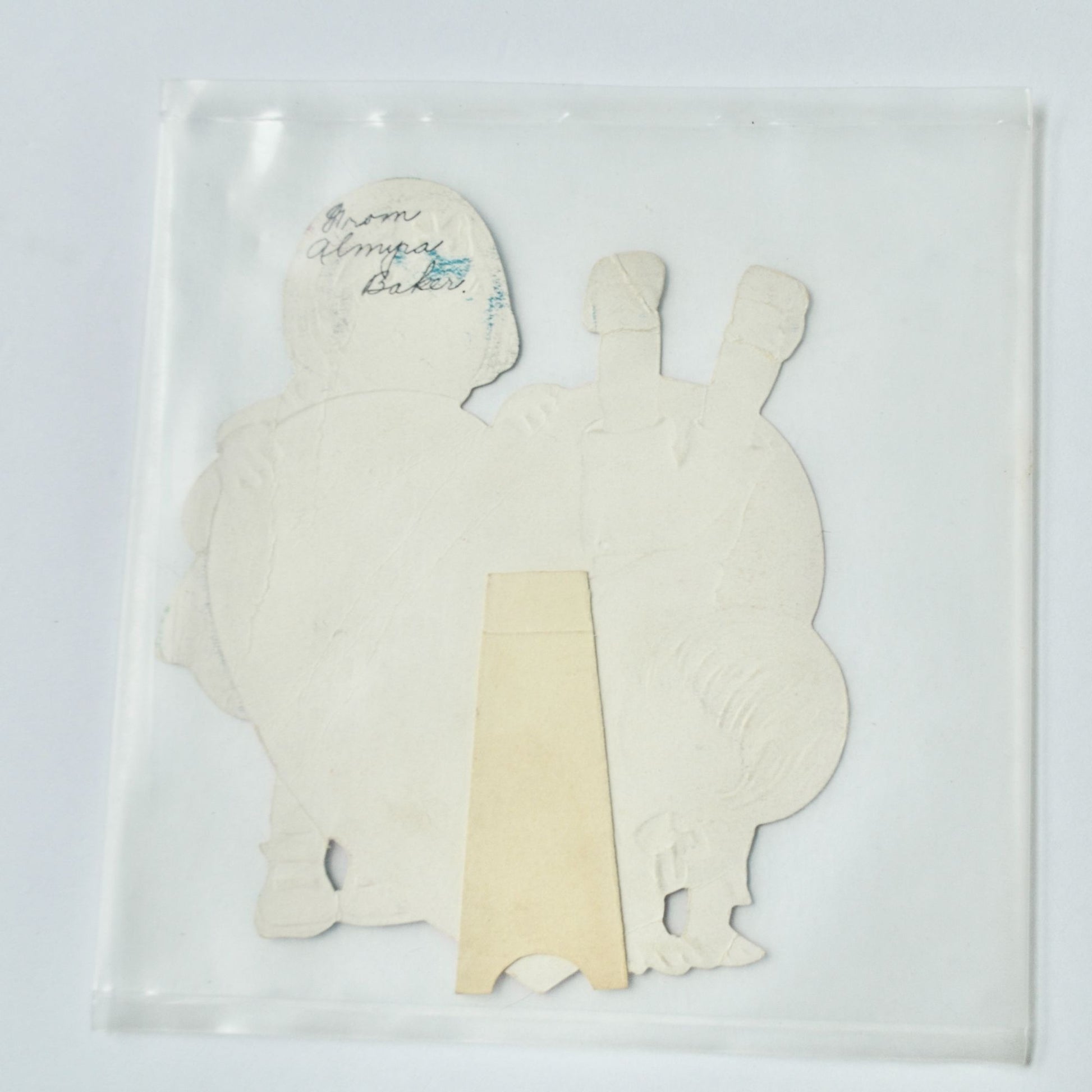 Good condition. Stored in protective plastic as shown. Has stand on back. Measures approximately 6" tall x 4.75" wide.