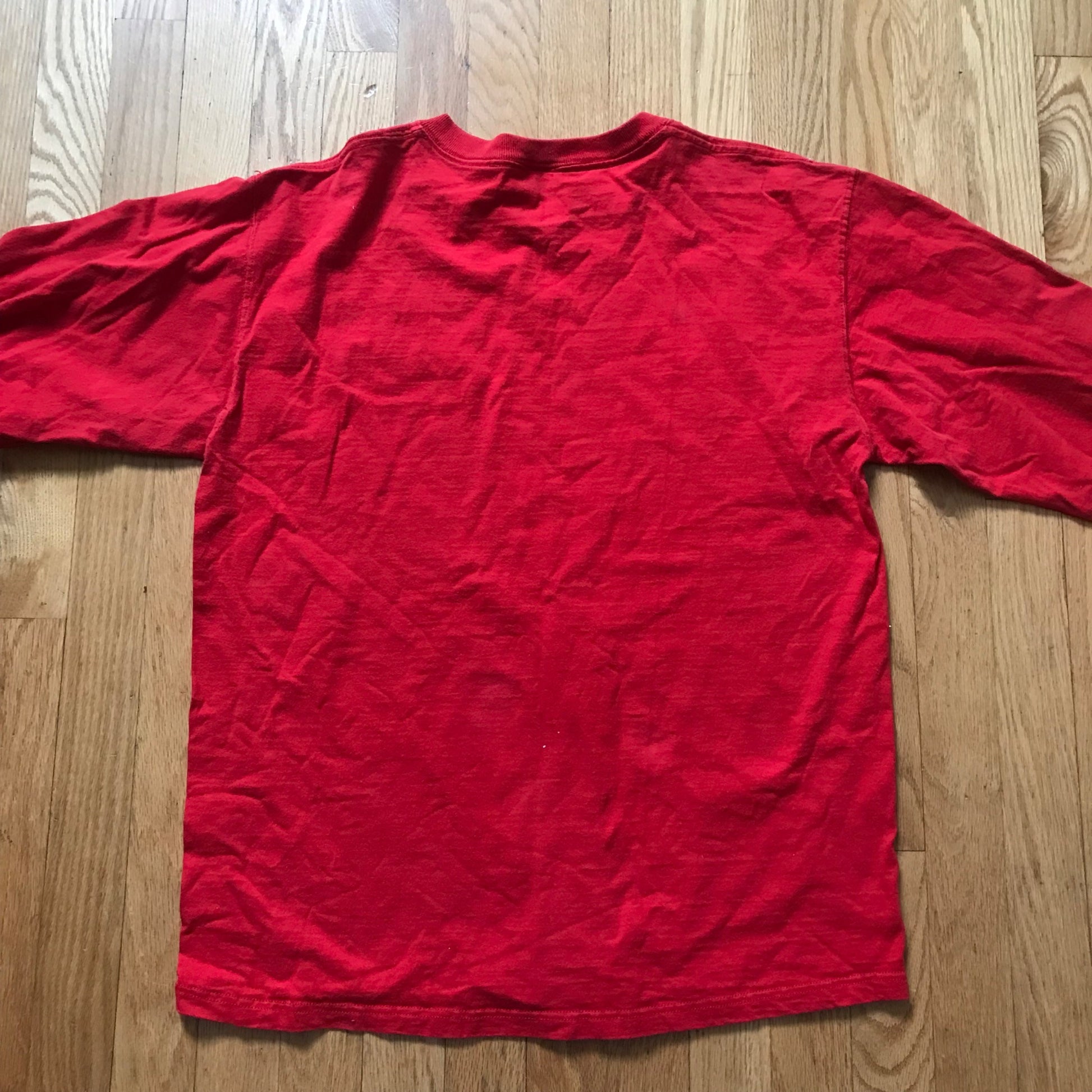 Tag is missing so unsure of the size. Measurements are 19.5 inches armpit to armpit, 23 inch sleeve length, and 23 inches neck to bottom of shirt. Shows normal wear/light fading but nothing too terrible. No rips or holes that I noticed. Comes from a non smoking home.
